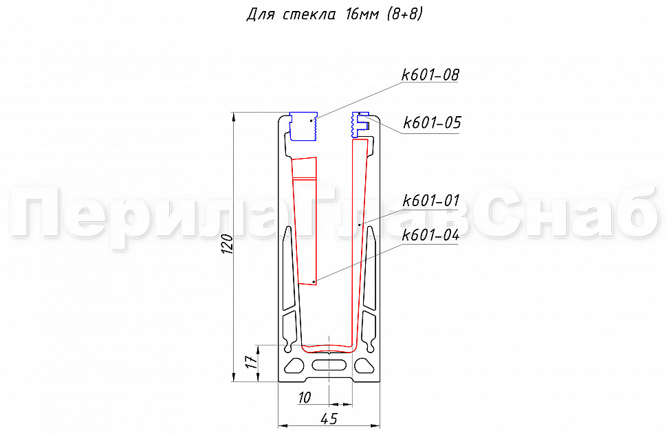 k601 — профиль для ограждений на несущем стекле (для стеклянных ограждений). Алюминиевый профиль чаще всего используется при строительстве таких объектов, как торговые дома, бизнес-центры, отели, спортивные сооружения. Максимально допустимая высота ограждения может доходить до 1200 мм, боковая нагрузка – до 430 кг. В данной модификации профиля предусмотрены крепежные отверстия. Наличие крепежных отверстий гарантирует более удобную и быструю установку профиля на объекте.