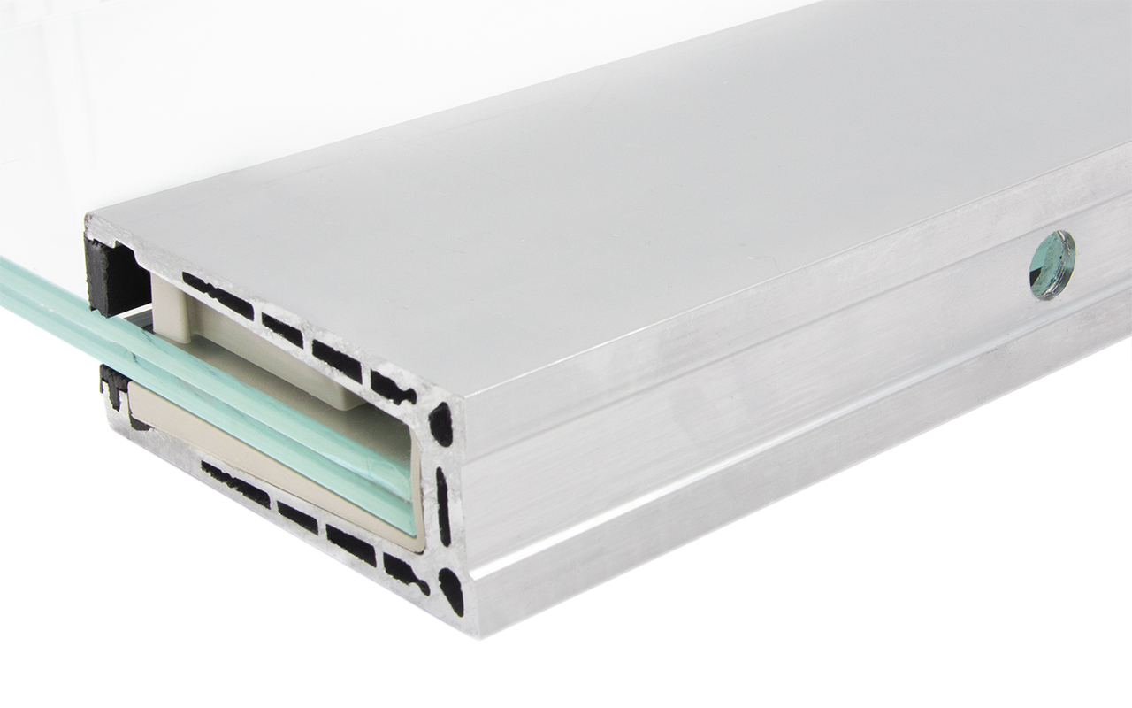 Профиль крепится на горизонтальную поверхность через отверстия, просверленные в нижней части профиля. Также профиль может быть смонтирован к боковой поверхности. Стекло вставляется сверху, зажимается распорными клиньями через уплотнительные резиновые прокладки. монтажный паз профиля закрывается резиновой накладкой. Накладки под любую толщину стекла - от 10 до 16 мм входят в комплект поставки. Дополнительно можно приобрести декоративные накладки из полированной стали и торцевые заглушки.