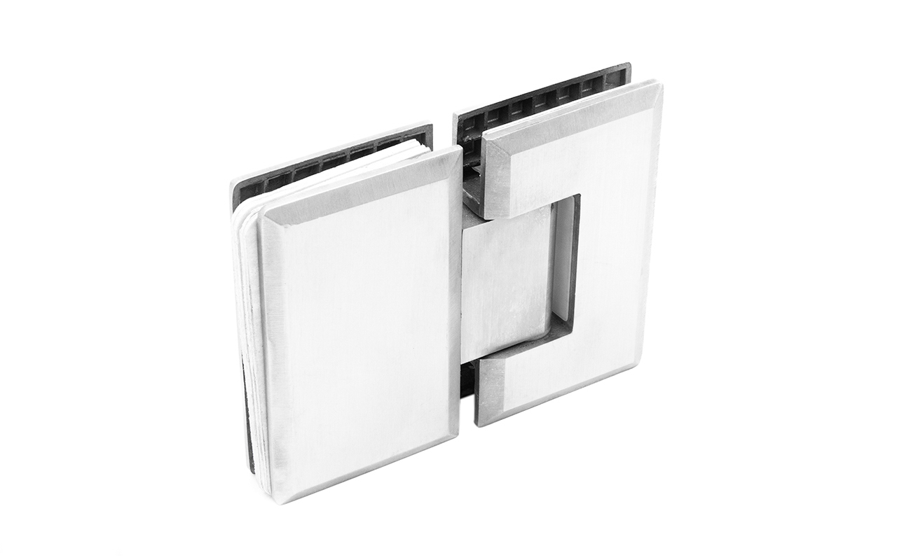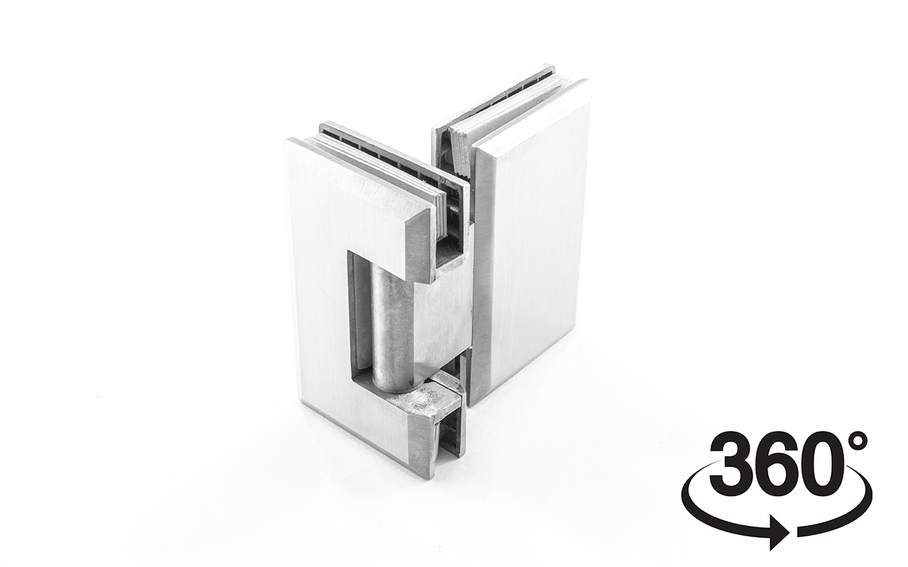 Петля из нержавеющей стали со шлифованной поверхностью из нержавеющей стали предназначена для стыковки между собой конструкционных элементов из стекла, толщина которых находится в диапазоне от 8 до 10 мм. Максимальный вес двери на 2 петли составляет 45 кг. В конструкции заложена система скрытого крепежа. Имеет функцию доводчика до закрытия от 25°. Максимальный угол разведения стыковочных элементов в плане составляет 180°