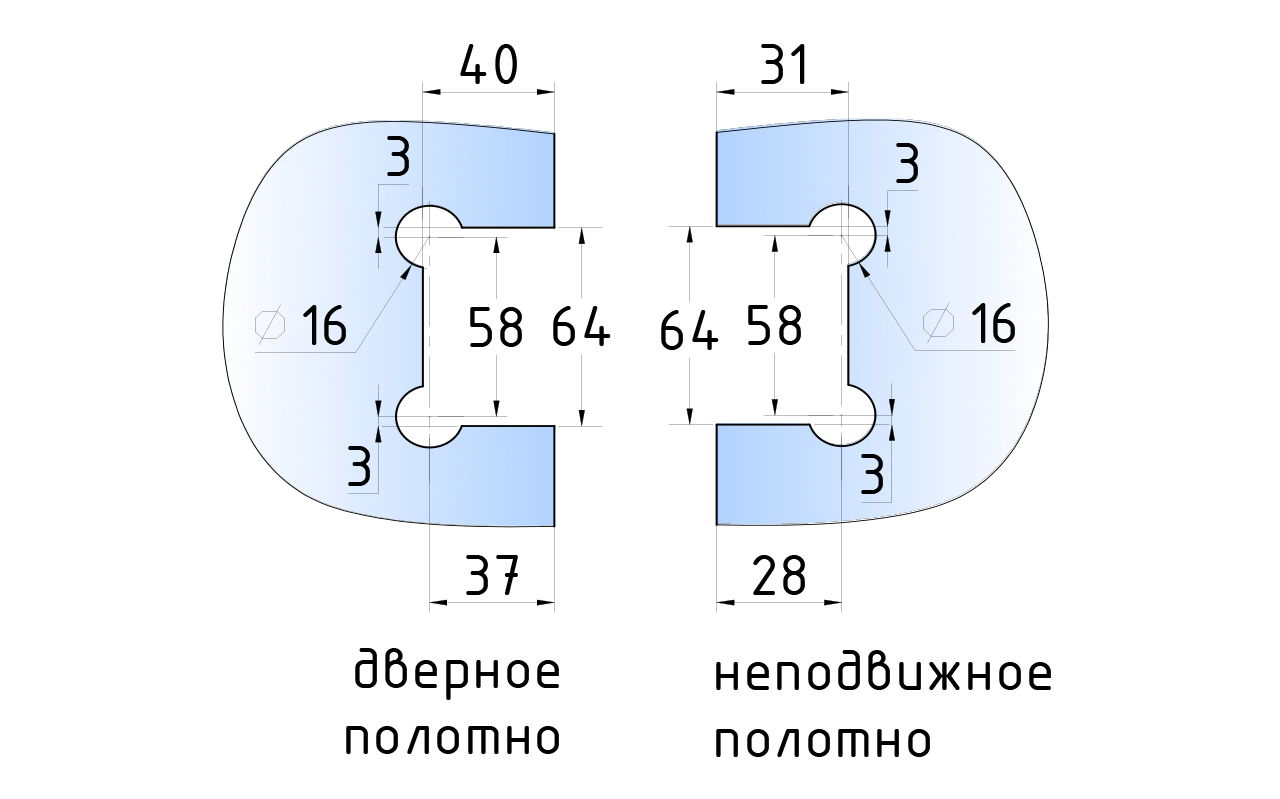 Крепление предусмотрено с двух сторон на 4 винта со шляпками заподлицо (по 2 винта на каждую сторону). Размер одной стороны петли составляет 90х55 мм. Петля стекло-стекло крепится с обеих сторон на стеклянные поверхности, плотно прижимаясь к ним своими металлическими зажимами.