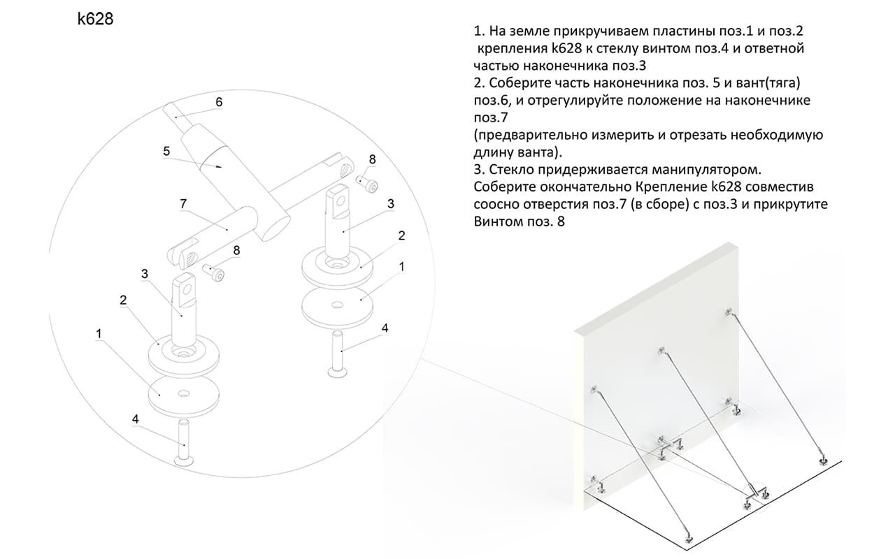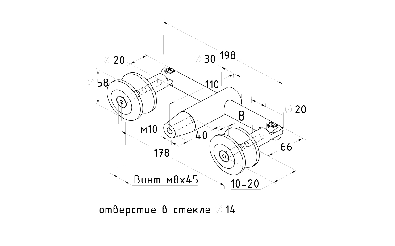 для крепления двух стёкол к ванте. Монтируется между стеклами в случае, когда необходимо поставить козырек с длиной по фасаду более 1300мм.