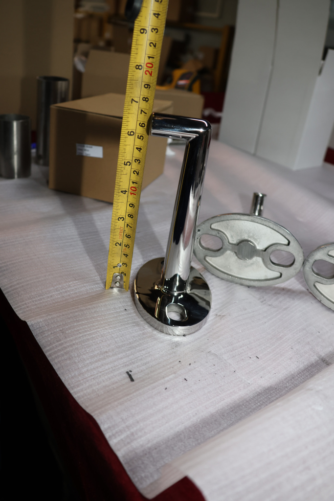 Держатель для подвеса стеклянного козырька (Соединение стена- рутель). Литая, полированная деталь, выполненная из стали AISI 304. Состоит из фланца толщиной 10 мм и шириной 80 мм и дистансера с резьбой М14. Размер дистансера 160 мм от стены до центра отверстия. На основании имеется два овальных крепёжных отверстия размером 16,5 на 25 мм.