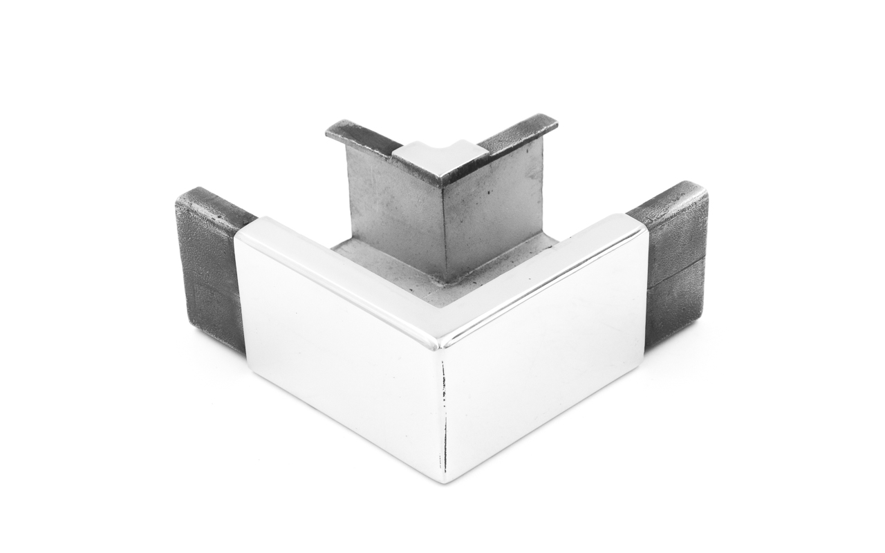 Фитинг предназначен для поворота поручня самосборных ограждений с несущим стеклом или с подсветкой под углом 90 градусов в горизонтальной плоскости.