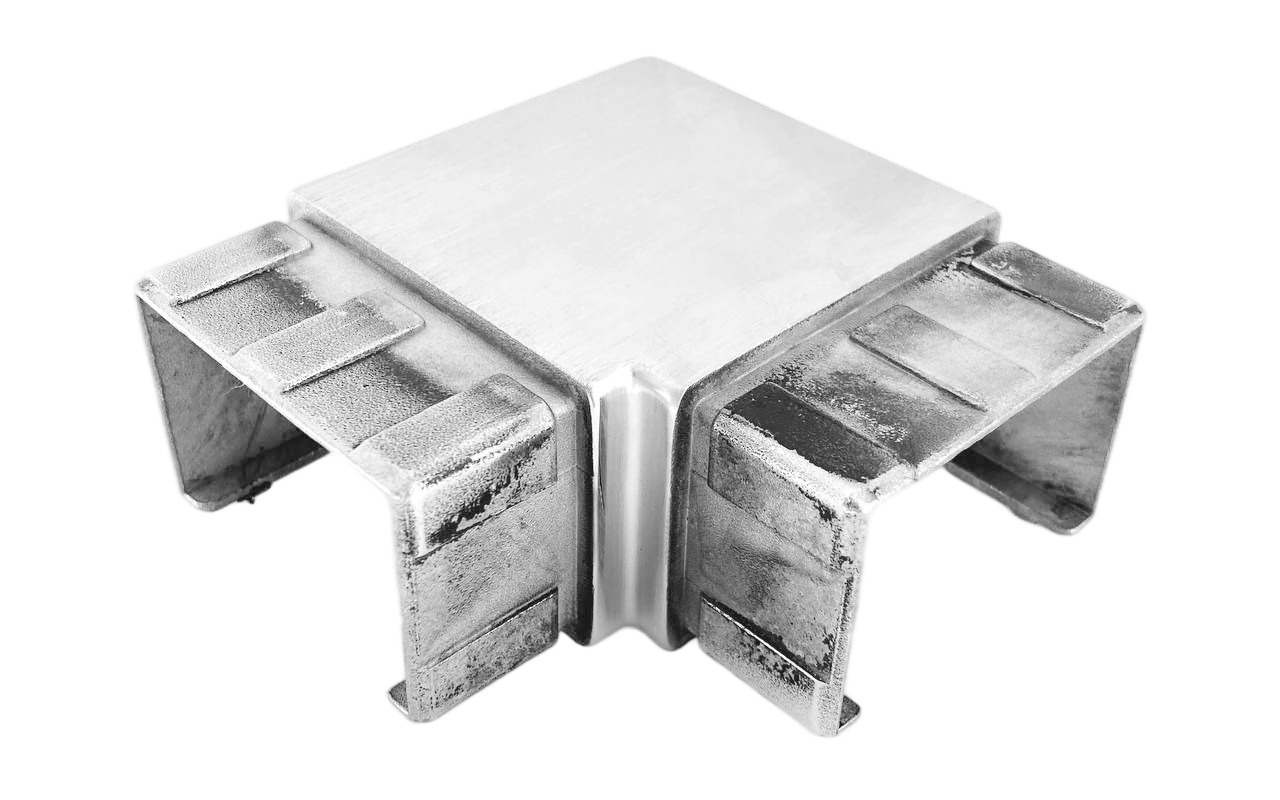 Фитинг предназначен для поворота поручня самосборных ограждений с несущим стеклом или с подсветкой под углом 90 градусов в горизонтальной плоскости.