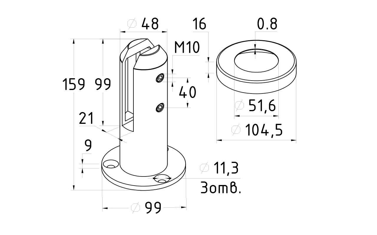 Стеклодержатель штампованный под стекло 10 мм (5+5 мм), под стойку Ø38.1 мм (39х24х55), полированный (AISI 304) k538-10