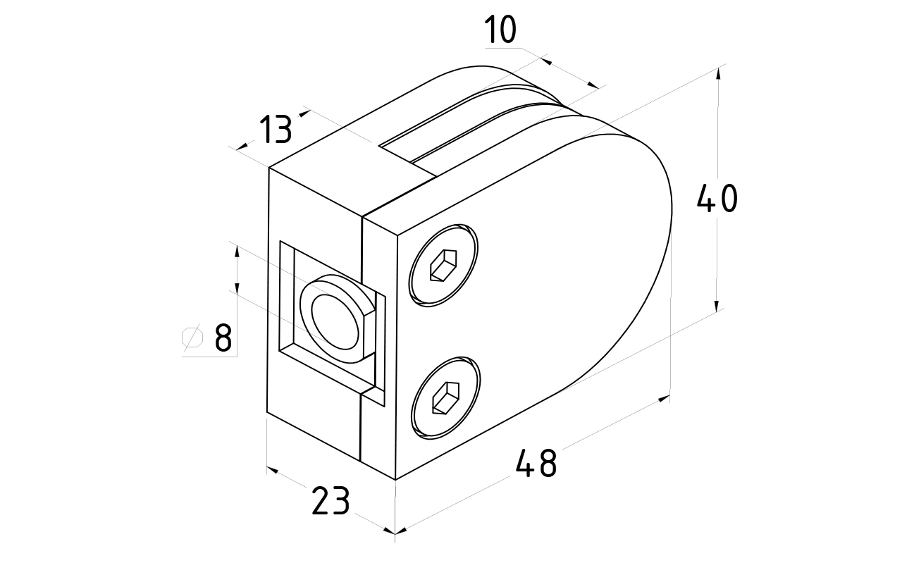 Данная модель выполнена методом литья, поэтому обеспечена существенным запасом прочности. По умолчанию, стеклодержатель подготовлен для зажима стекла толщиной 8 мм, но если нужно использовать на ограждении стекло 10 мм, нужно заменить штатные уплотнители на модель k005. Габариты: 40х22х50 мм