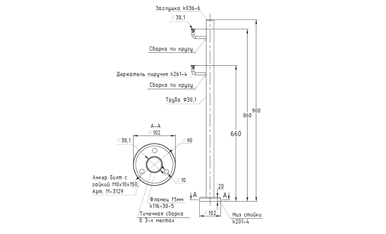 Готовые стойки – это экономия вашего времени и денег. Приобретая готовую стойку Вы можете собрать ограждение сами, не привлекая монтажную бригаду и экономя денежные средства на монтаже. Стойка легко монтируется к полу благодаря треханкернуму фланцу с отверстиями под анкер-болт М8 ( М-3129, М-3843, М-3838), а крепеж скрывает декоративная крышка идущая в комплекте стойки. Поручень из нержавеющей стали так же легко закрепить при помощи сверла по нержавеющей стали (k961-03, k961-03.5, k961р-03.5, k961р-03) и самореза ( М-3850, М-3847, М-3215). Либо при помощи заклепки ( М-3214) и винта М6 ( М-3973), для крепления при помощи заклепок необходимо растачивать отверстие в ложементе. Если вы используете пластиковый ( k893, k897, k892, k891, k894, k895, k899) или деревянный поручень, то его можно закрепить при помощи саморезов ( М-3217)