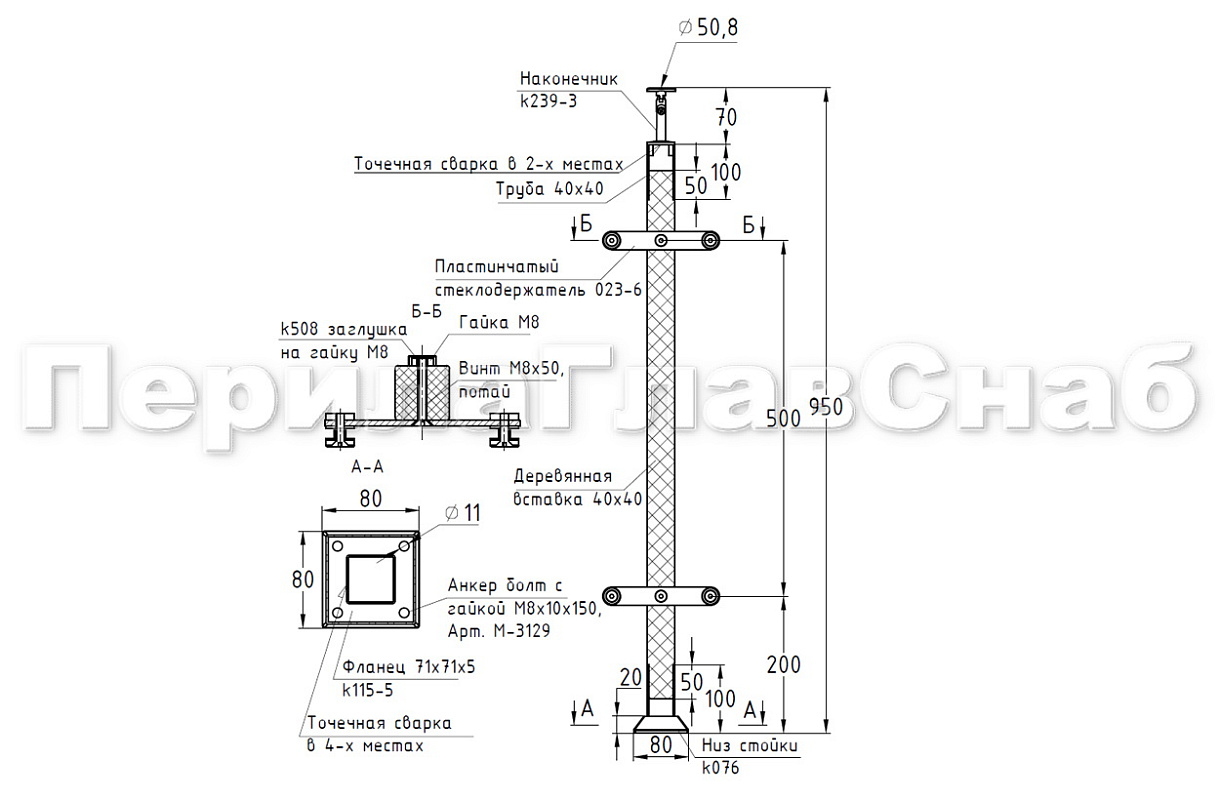 Готовая стойка 40х40х950 мм, деревянная, со вставками из нержавеющей стали 2х100 мм с 3 ригеледержателями k740-1-G купить в Волгограде