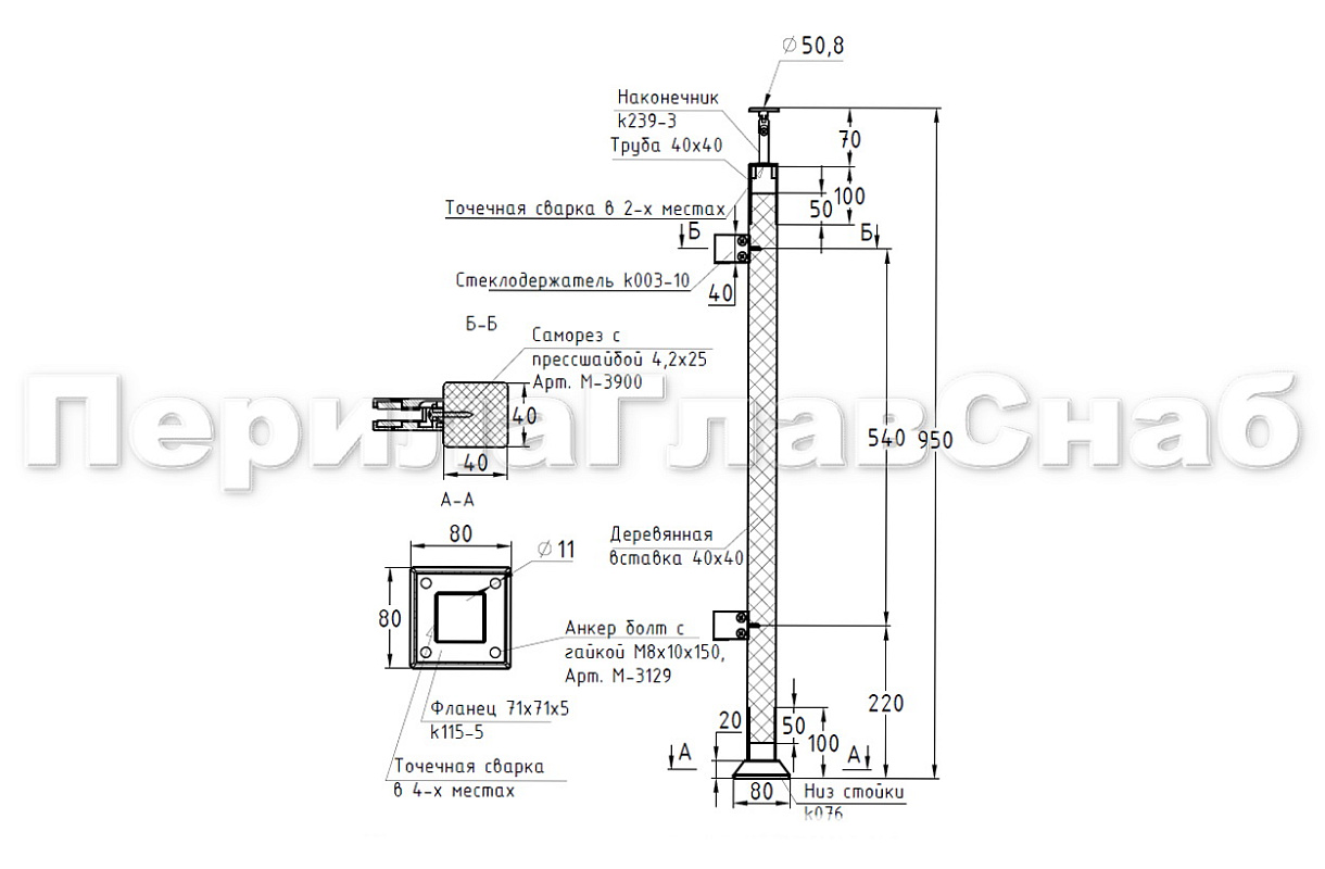 Готовая стойка 40х40х950 мм, деревянная, со вставками из нержавеющей стали 2х100 мм с 3 ригеледержателями k740-1-G купить в Волгограде
