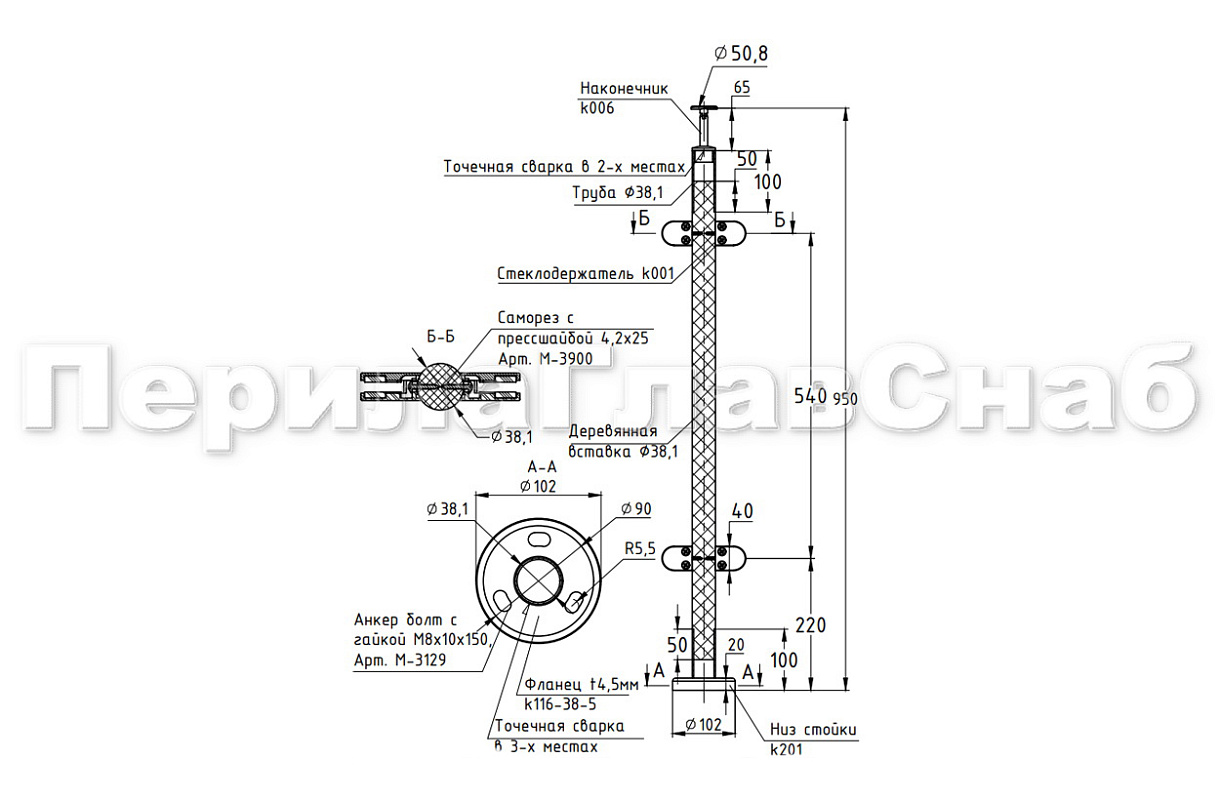 Готовая стойка Ø38,1 мм, с фланцем и наконечником, высота 950 мм, полированная (AISI 304) k702 купить в Волгограде