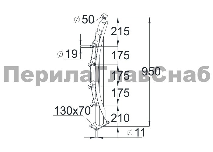 Готовая стойка 40х40х950 мм, деревянная, со вставками из нержавеющей стали 2х100 мм с 3 ригеледержателями k740-1-G