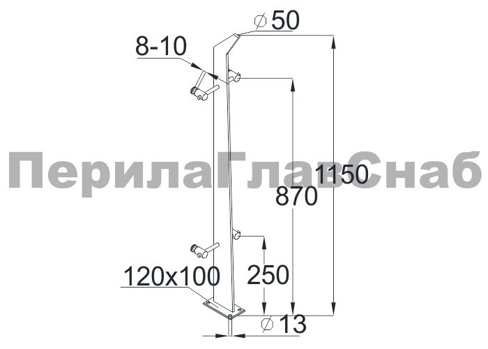 Стойка круглая Ø38.1: 2 литых зажимных стеклодержателя, под стекло 8-10 мм, полированная, высота 950 мм (AISI 304) k722-L