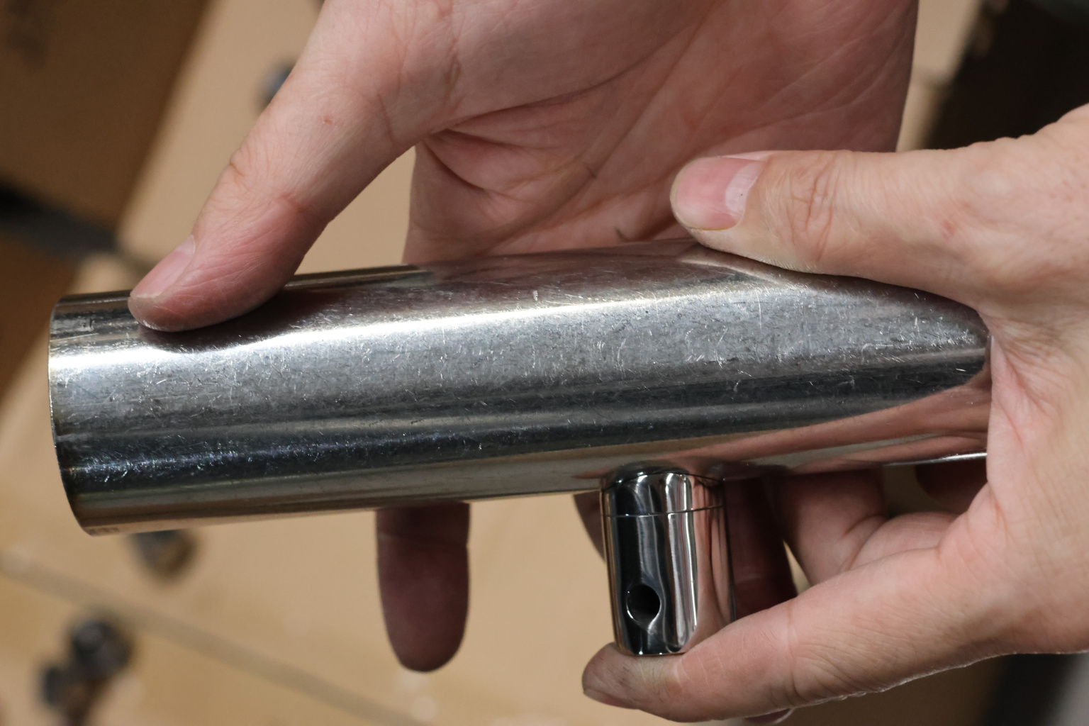 нержавеющий, проходной держатель тросика Ø6 мм, 22х30мм, в виде бочонка на круглую стойку Ø38.1- 42.4 мм, шлифованный (aisi 304)