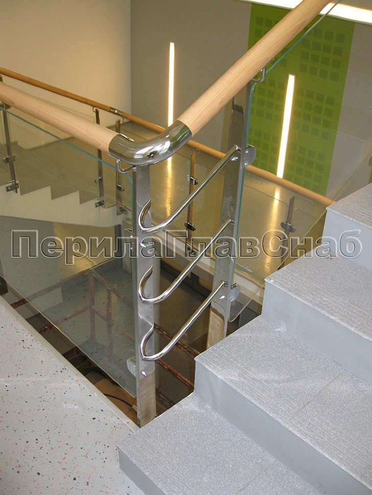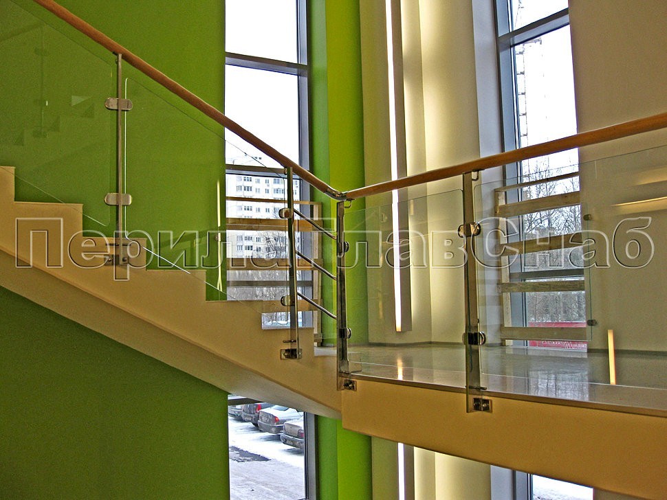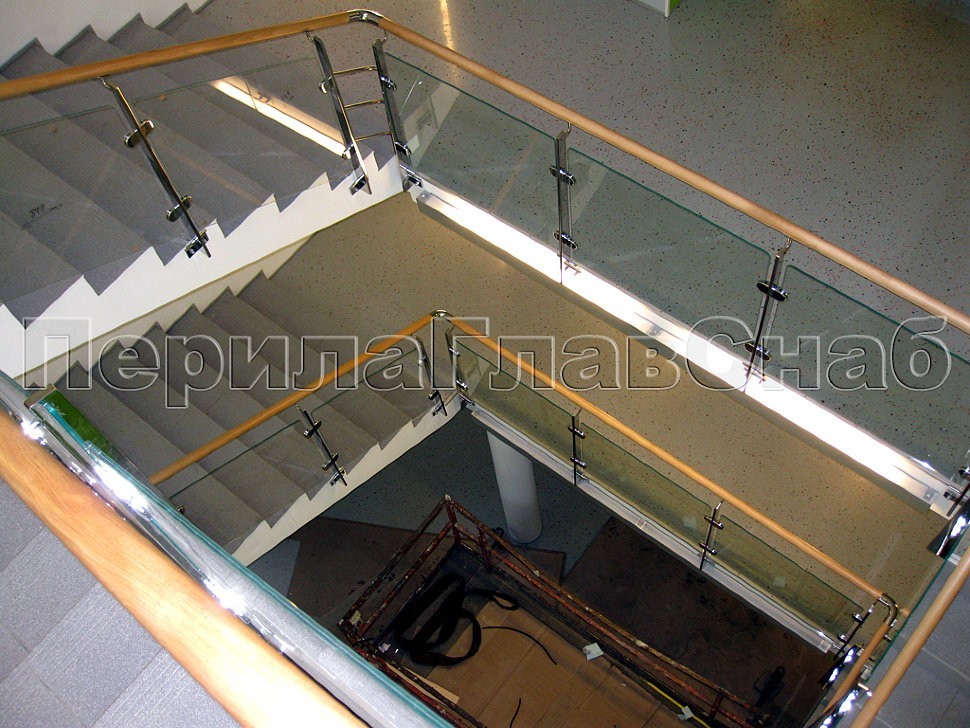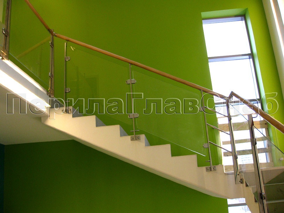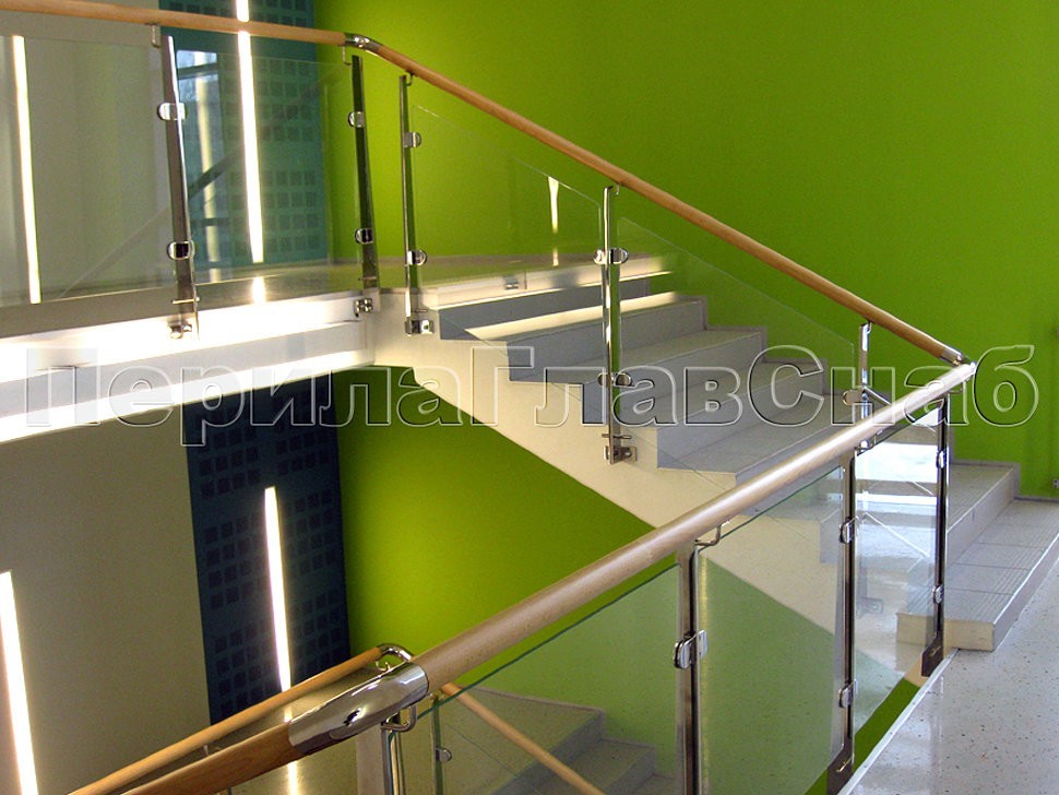 В здании офиса TIKKURILA в Москве было установлено ограждение лестницы со стеклом и деревянным поручнем на торцевых профильных полированных стойках из нержавеющей стали.
