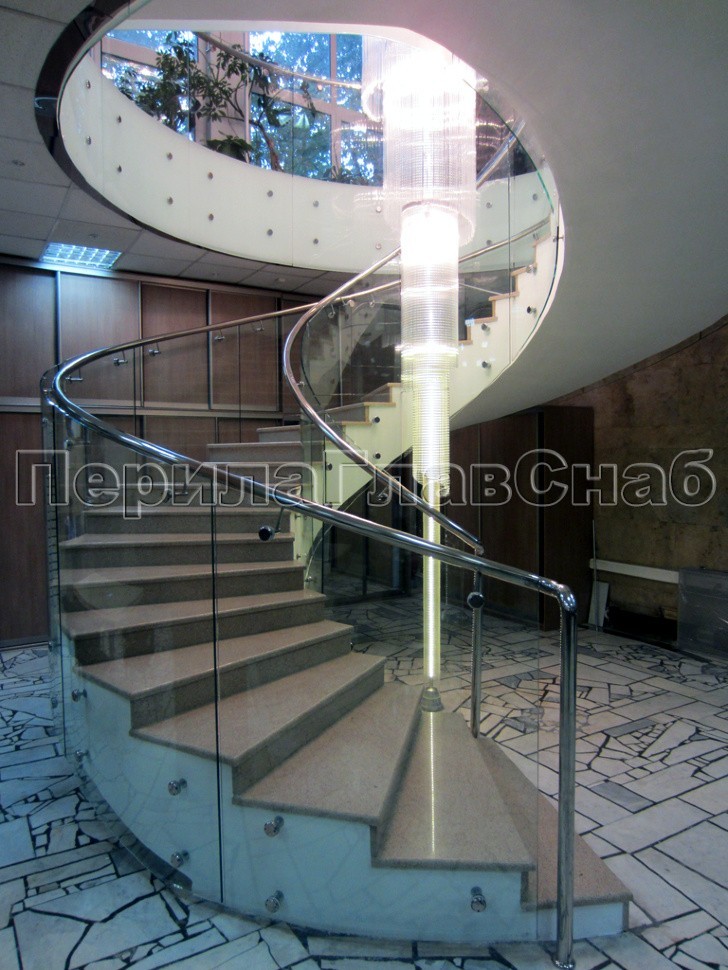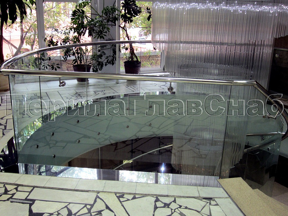 Крепление несущего моллированного (изогнутого) стекла было торцевым, относительно лестничного марша и атриума, а сверху, на выносах, к стеклу смонтирован полированный поручень из нержавеющей стали.