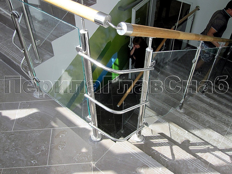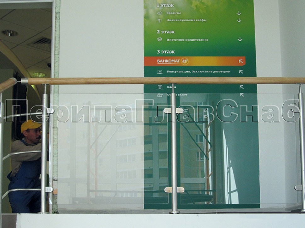 Ограждение лестницы со стеклом и деревянным поручнем в здании Сбербанка от компании «ПерилаГлавСнаб».
