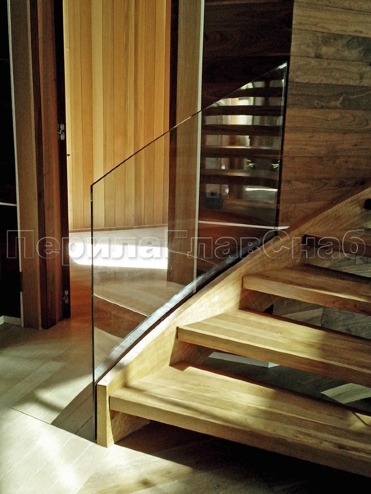 Ограждение забежной лестницы в частном доме выполнено на несущем стекле, поручень на выносных держателях завязан в пол.