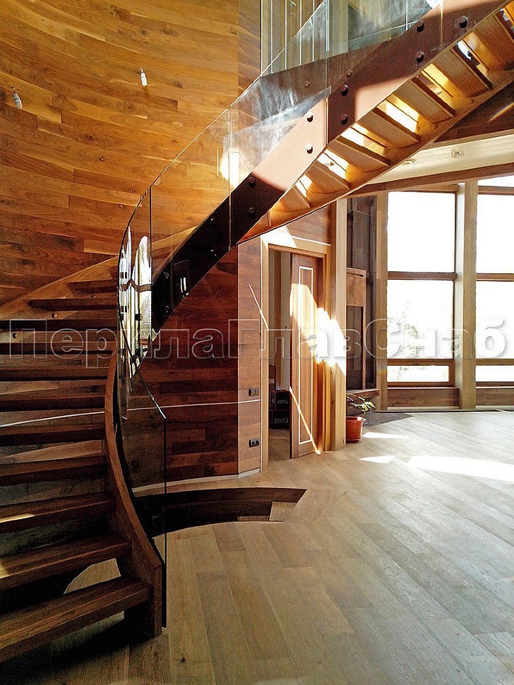 Ограждение забежной лестницы с моллированным стеклом. Нержавеющий полированный поручень повторяет контур стекла.