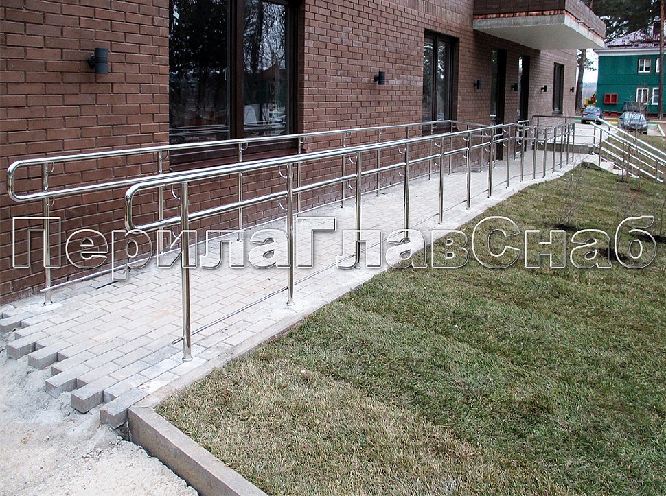 Ограждения для пандусом со сдвоенным поручнем ( выносное крепления для верхнего и нижнего поручня) и с ригелем для увеличения жесткости конструкции. Ограждение пандусов полностью соответствует ГОСТ.