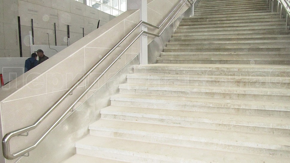 На станции “ЗИЛ” был установлен пристенный наружный двойной поручень диаметром 50,8мм. Поручень выполнен из полированной нержавеющей стали марки AISI 304, крепится к стене на выносных держателях через плитку в бетон на высоте 700мм и 900мм. Сам поручень завязан окончанием “бублик”, а сварные швы зачищаются, шлифуются и полируются. Крепления нержавеющих элементов ограждения между собой выполнены методом точечной аргонно-дуговой сварки, длина швов- 2мм, с последующей зачисткой и полировкой.