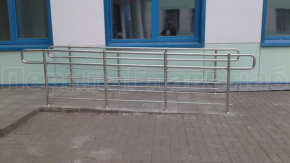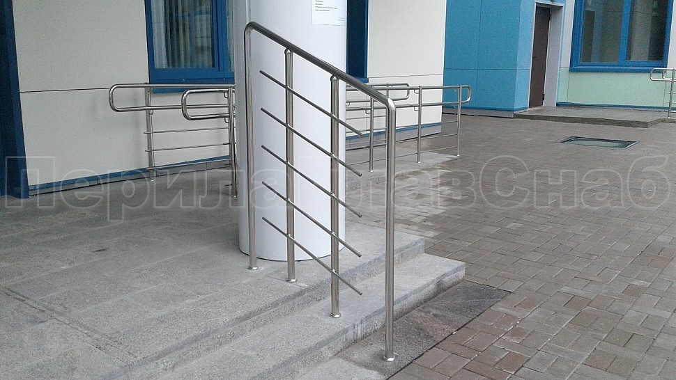 Снаружи здания были установлены ограждения на крыльце из полированной нержавеющей стали высотой 1200 мм. Труба стоек диаметром 38 мм крепится в бетонную поверхность методом алмазного бурения на глубину 70 мм, диаметр отверстия 42 мм. Установлены на расстоянии 300 мм друг от друга. Между стойками установлены пять ригелей горизонтальным заполнением, диаметр ригельной трубки 16мм, крепятся к стойкам при помощи сварки.