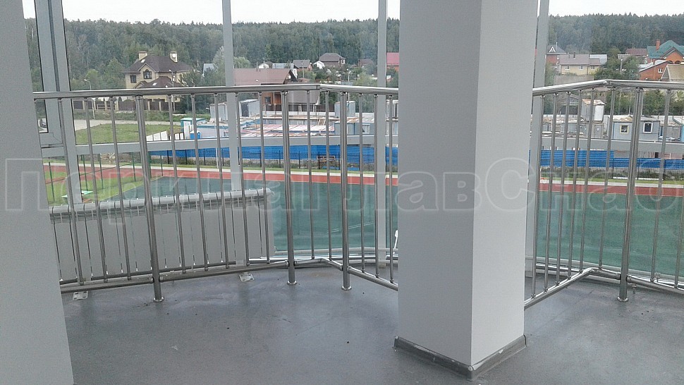 • Ограждения витражей зимних садов выполнены из полированной нержавеющей стали марки AISI 304 высотой 1200 мм от пола. Стойки трубой диаметром 38 мм крепятся в пол на глубину 70 мм при помощи бурения, установлены друг от друга на расстоянии 1000-1200 мм друг от друга. Между стоек вертикальным способом установлены ригели, диаметр трубки 16 мм. Вставляются в пазы перфорированной трубы с шагом 100 мм.