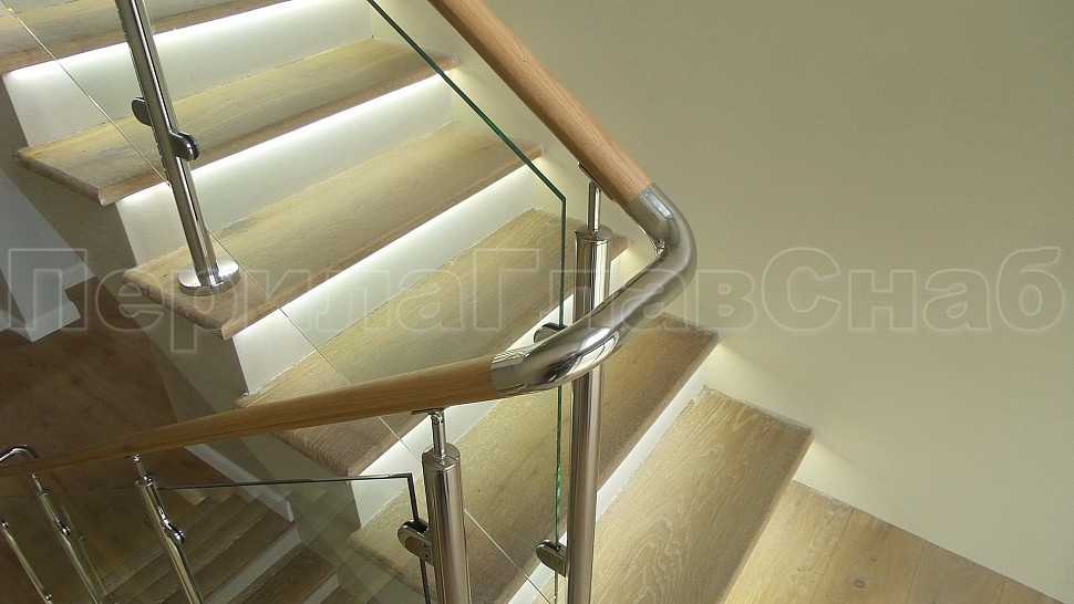 Стильное ограждение из нержавеющей стали с деревянным поручнем - оптимальное решение для частного дома. Деревянный поручень, в отличие от металлического, теплый на ощупь - за него удобно и приятно держаться. Сочетание натурального дерева и нержавеющей стали выглядит очень стильно и такое ограждение великолепно впишется в любой интерьер. В нашу компанию поступил такой заказ. Ограждения из полированной нержавеющей стали внутренние со стеклом высота 950 мм, стойки диаметром 38 мм, крепление сверху методом алмазного бурения диаметр 42 мм на глубину 70 мм, устанавливаются через две ступени в третью, на прямых участках не более 1000 мм друг от друга, наконечник стойки штырь; стекло закаленное прозрачное 8 мм, крепится на зажимные стеклодержатели; низ стойки декоративная крышка диаметр 56 мм, поручень деревянный диаметр 38 мм из дуба тонированный и лакированный, окончание поручня заглушка, уходов поручня в стену через фланец, поручень завязан нержавеющим отводом. Крепление нержавеющих элементов ограждения между собой точечная аргонно-дуговая сварка, с последующей зачисткой и полировкой.