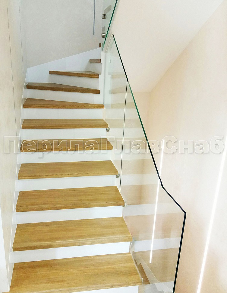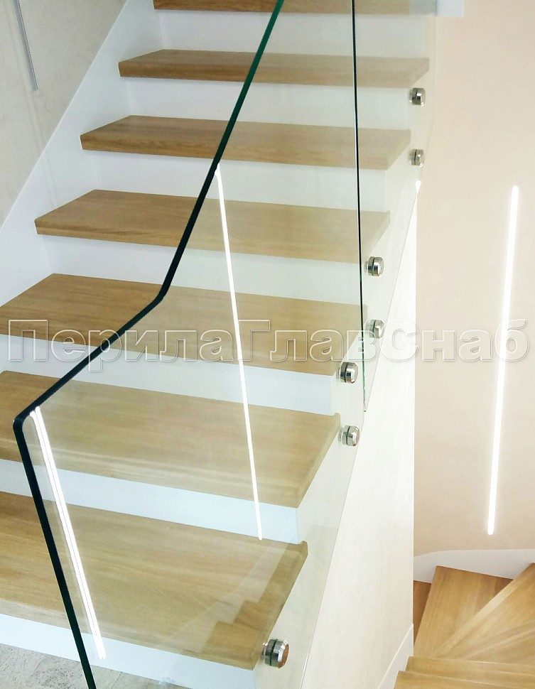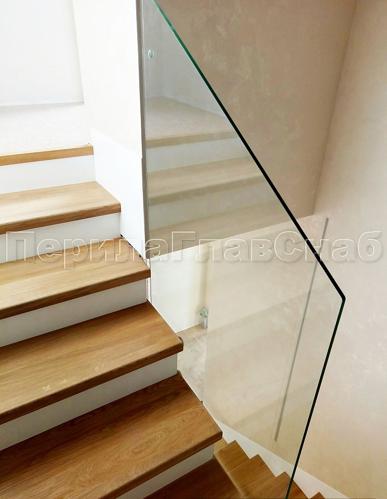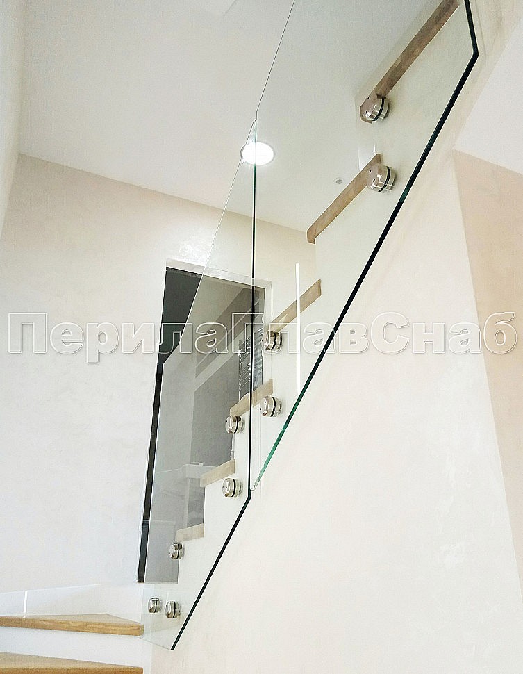 Стекло прозрачное, каленое 10 мм, крепится к торцу лестничного марша на точечном креплении из нержавеющей стали.