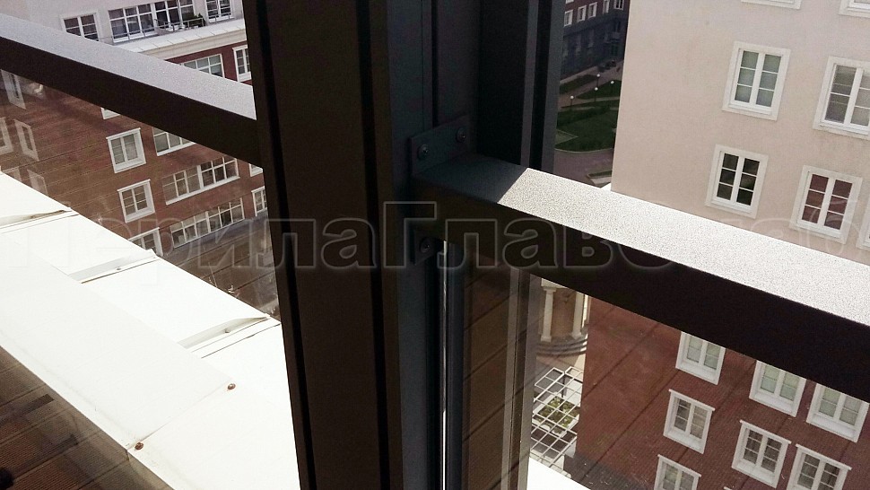 Такой заказ поступил к нам в компанию на ограждения балкона высотой 1200мм из прозрачного каленого стекла 12мм и с поручнем 60х40мм из полированной нержавеющей стали AISI304. Стекло крепится с торца к парапету с внутренней стороны при помощи точечного держателя. Поручень крепится к алюминиевым колоннам через фланцы. Поручень, фланцы и точечные держатели окрашены порошком по цвету антроцит.