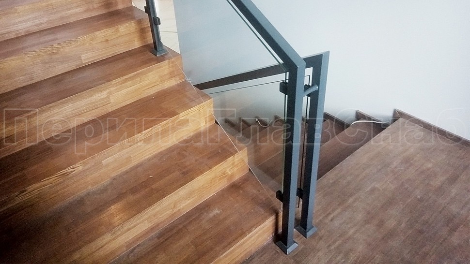 В компанию поступил заказ на ограждение лестницы из черного металла со стеклом. Высотой 950 мм и стойками 40х40 мм из черного металла, крепление стоек сверху методом бурения, стекло каленое прозрачное 8 мм, крепятся на штампованные зажимные стеклодержатели покраска по RAL (серый антрацит), поручень профильная труба 40х40 мм из черного металла, поручень завязан, окончание поручня заглушка.