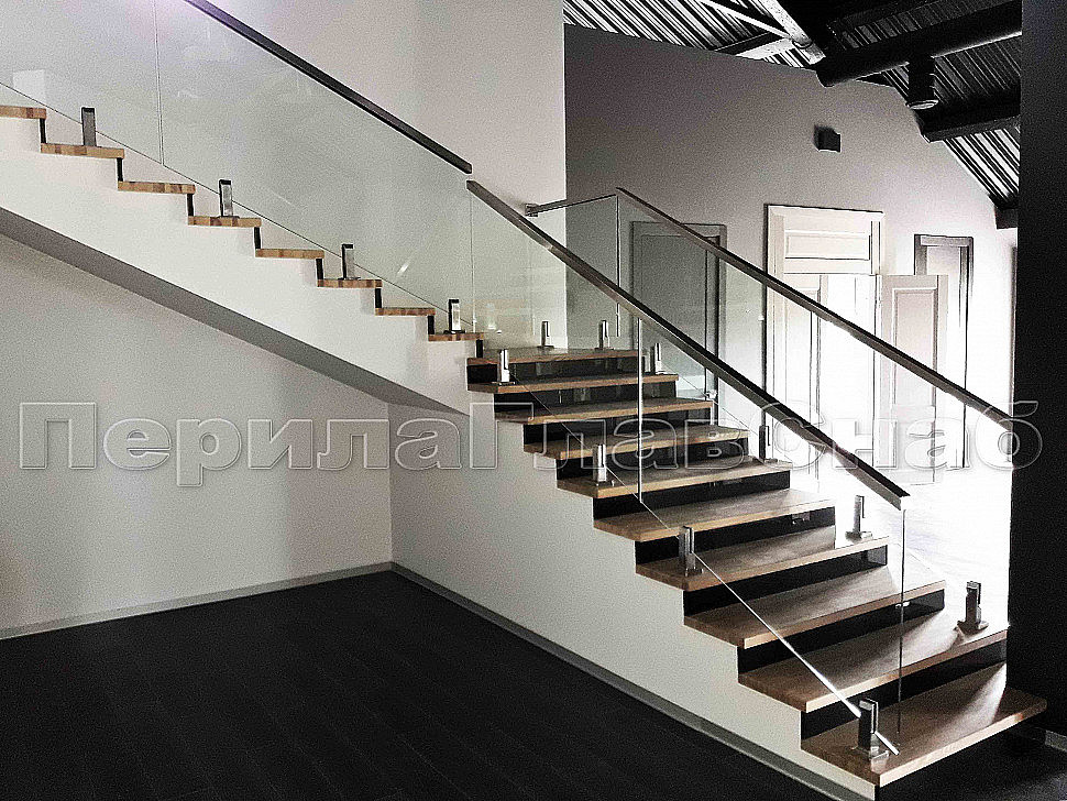 Было рассмотрено два вида крепления стеклянных ограждений, а именно на алюминиевом профиле и мини-стойках. Алюминиевый профиль в рамках этого конструктива установить нельзя, поэтому решение было принято сделать стеклянные ограждения на квадратных мини-стойках. Ограждения внутренние на несущем стекле, конструктив: высота 1000мм от уровня пола. Поручень выбрали с пазом – шлифованный, размер 60*40, благодаря текстуре шлифовки смотрится очень современно и стильно.