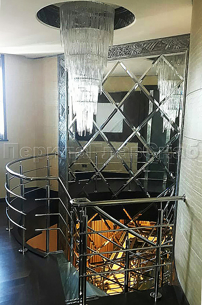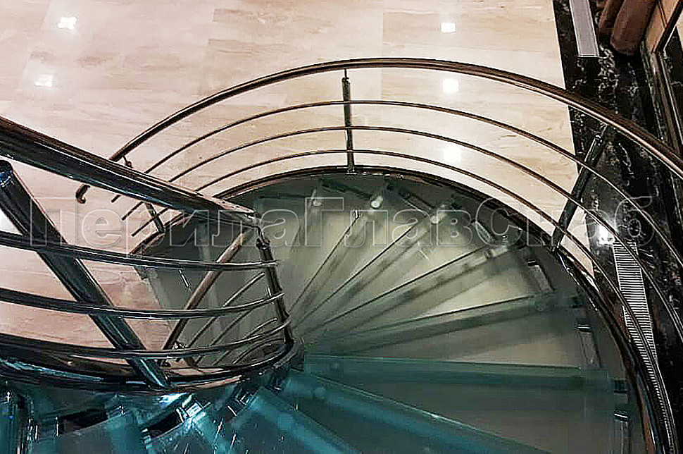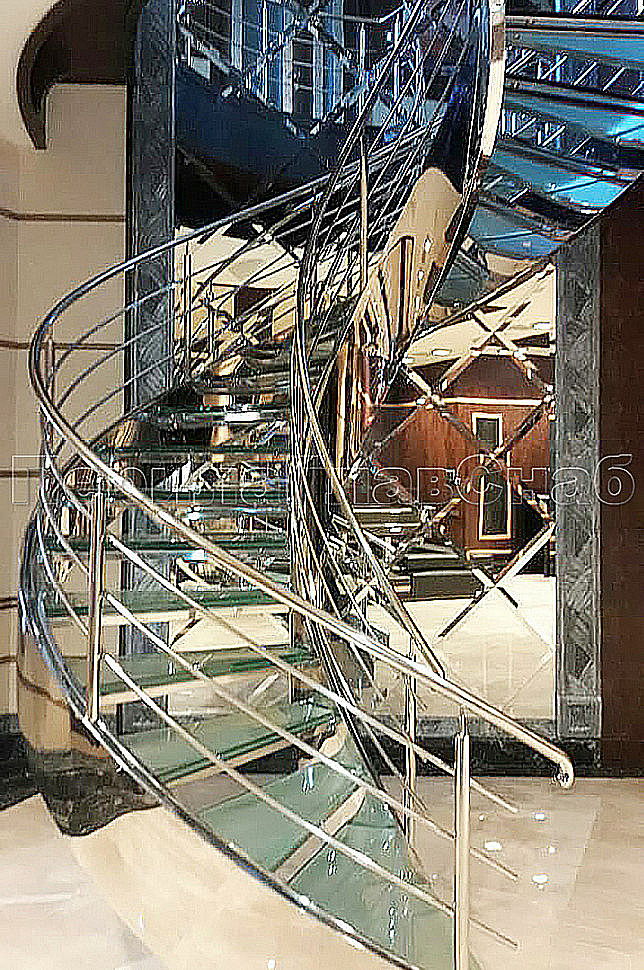 Винтовая лестница позволяет компактно расположить переход с этажа на этаж и сделать помещение более просторным. Закрученная конструкция из труб, выполненных из нержавеющей стали, дополнена стеклянными ступеньками, которые предоставляют простор для подсветки и общего оживления интерьера.Жесткость конструкции получена благодаря применения тетив из толстого металла, который прокатан по винту и обшит декоративным листом из полированной нержавеющей стали. Тетива — основной несущий элемент, к которому крепятся ступени.