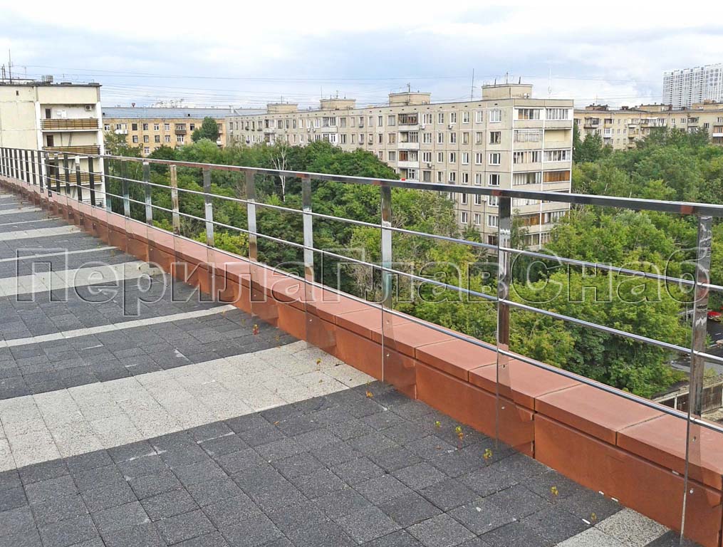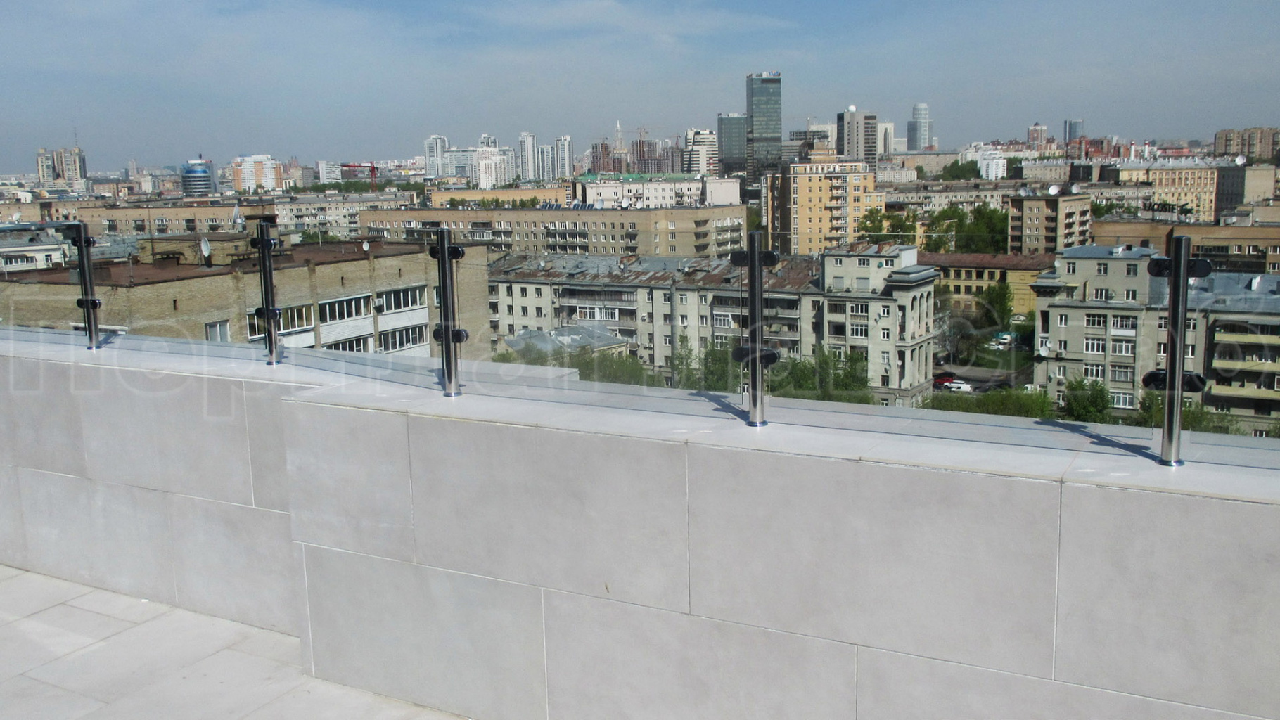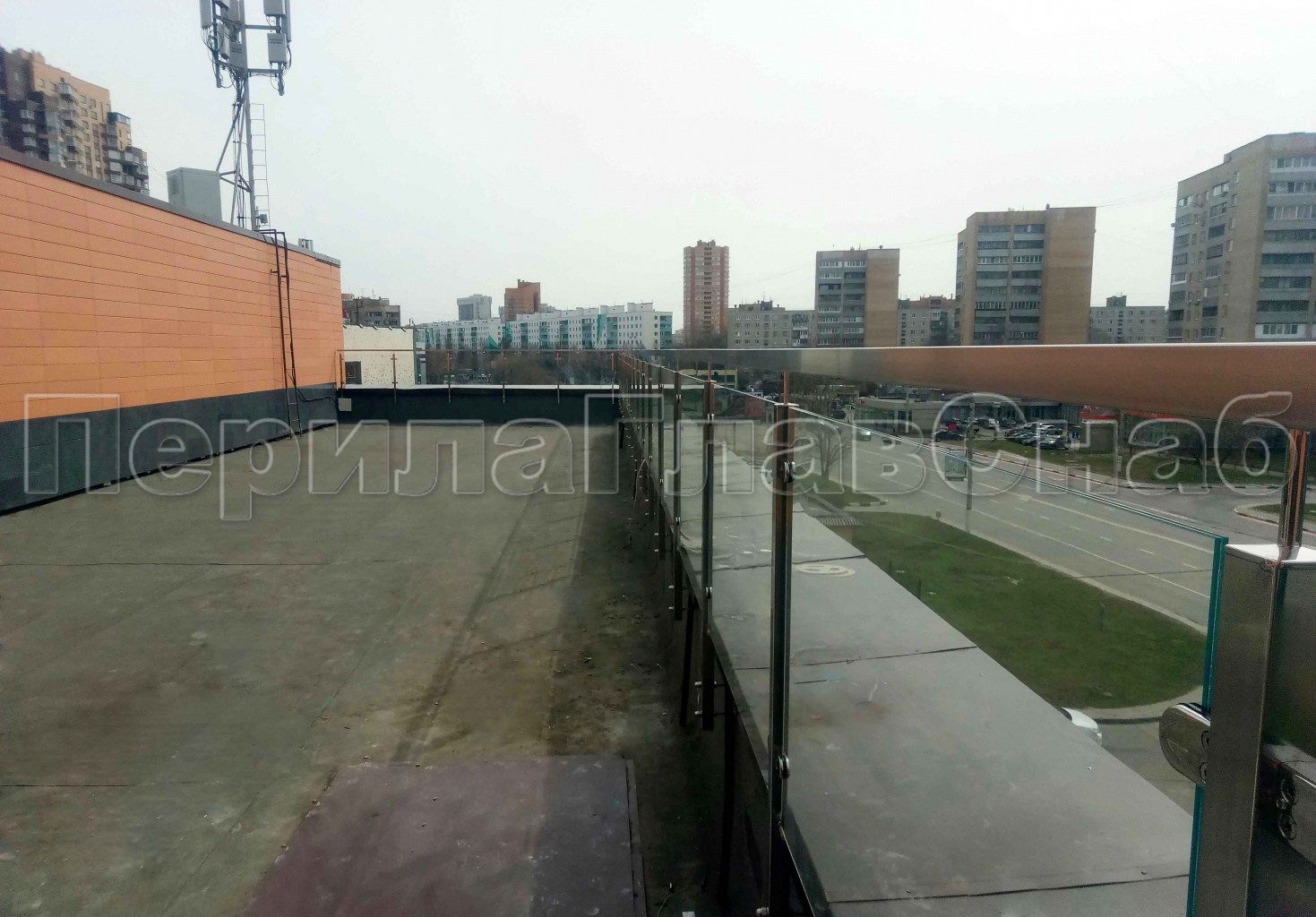 Стеклянные ограждения кровли со стойками на крыше многоэтажного дома. Дешевый аналог.