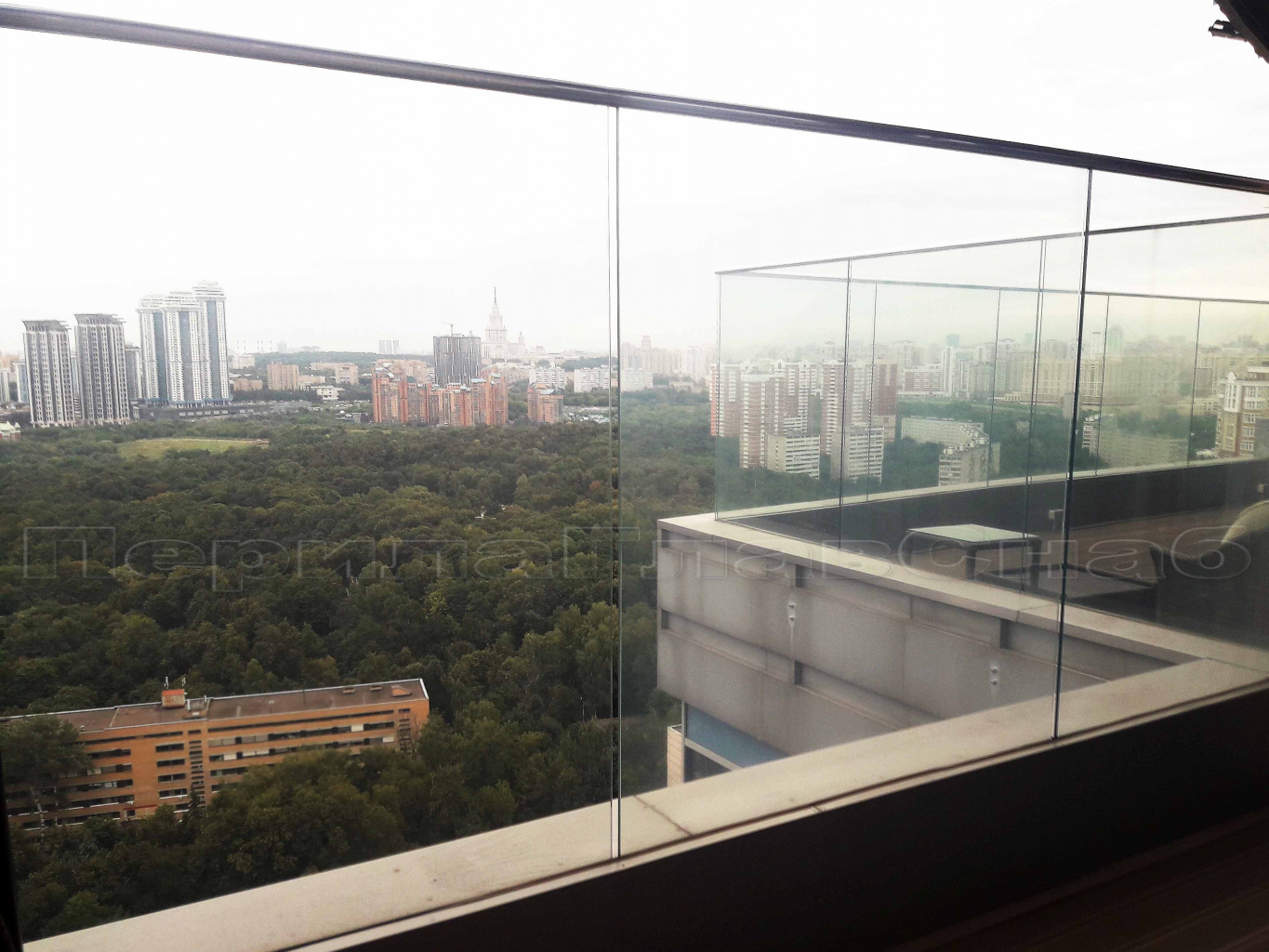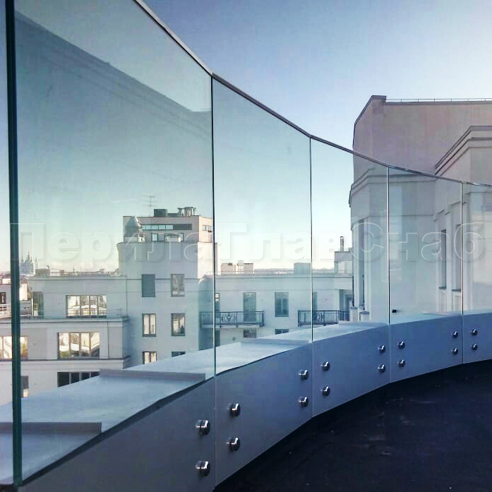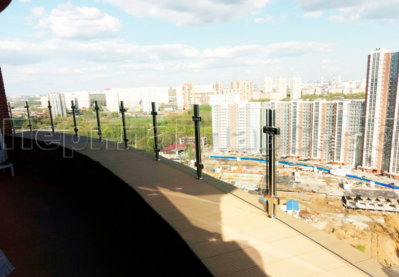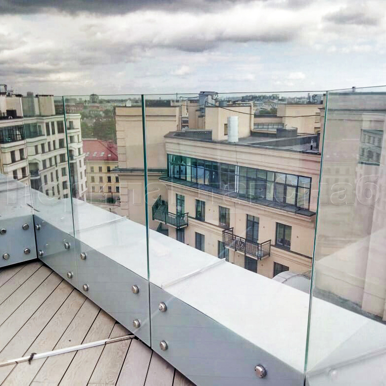 Стеклянные ограждения кровли со стойками на крыше многоэтажного дома. Дешевый аналог.