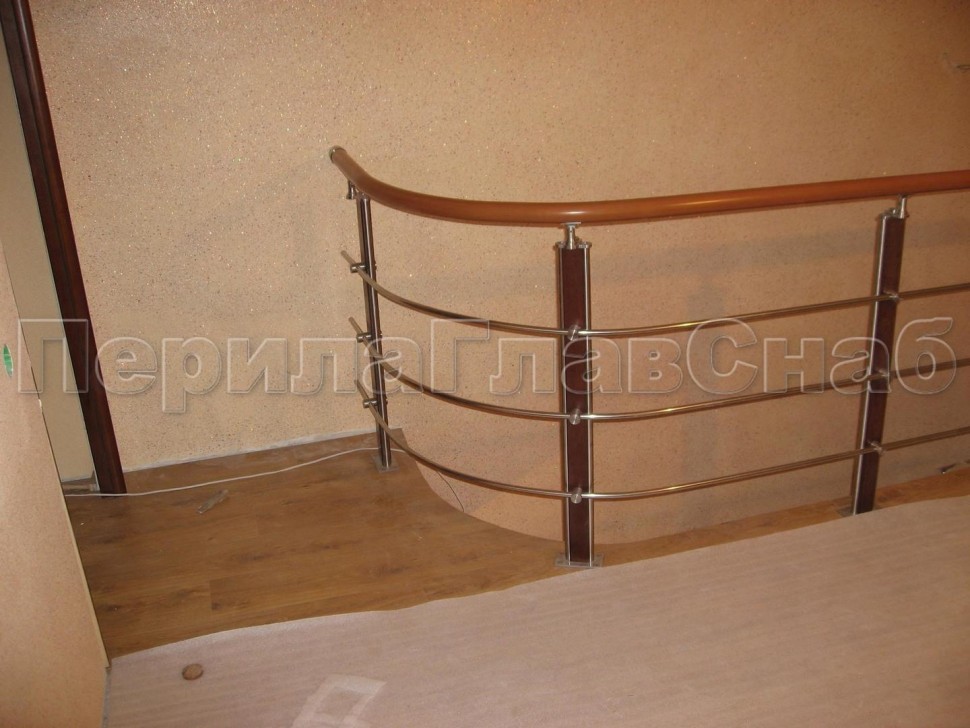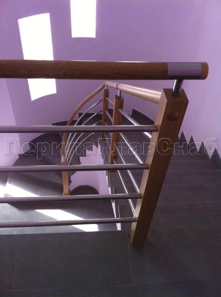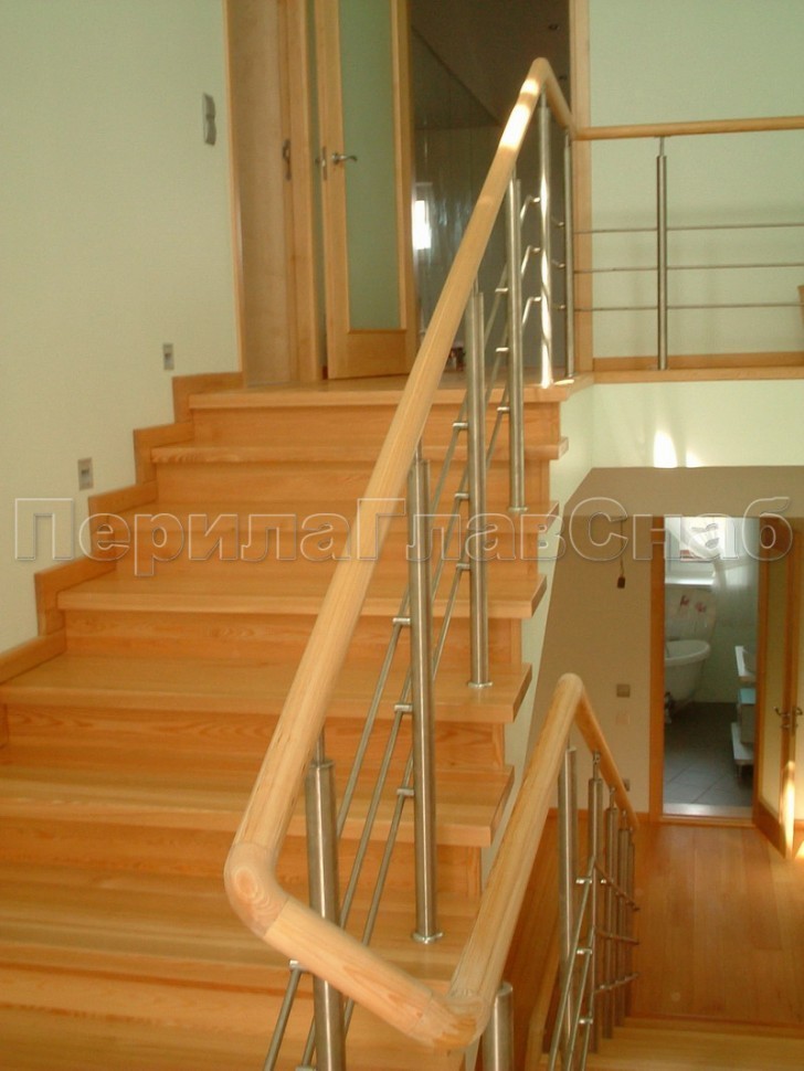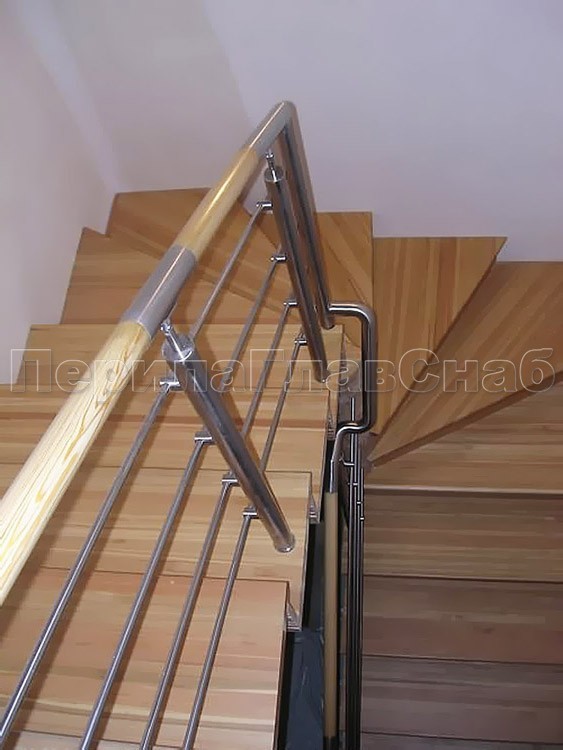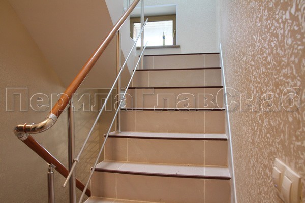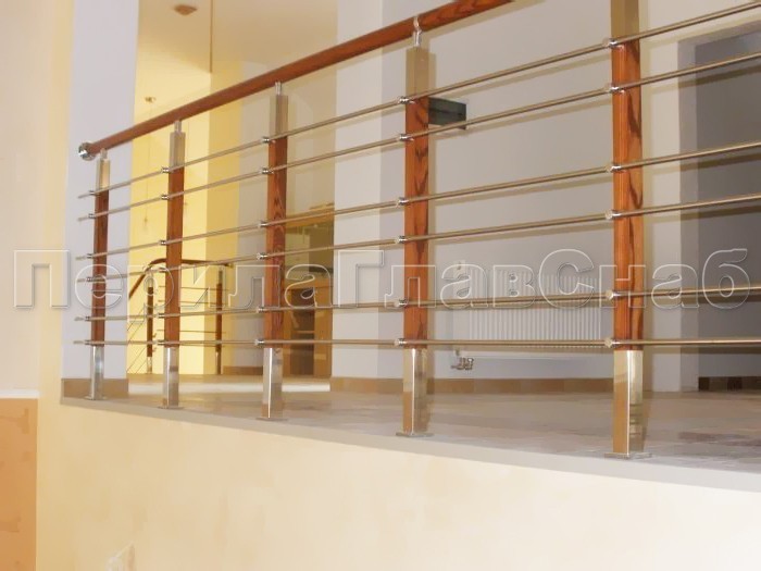 Нержавеющие ограждения без ригелей с круглым поручнем и стойками с деревянными вставками