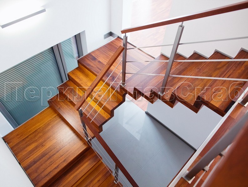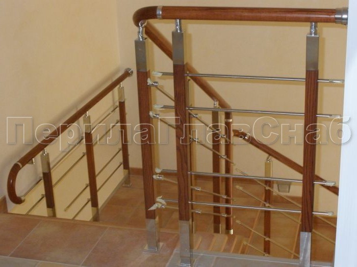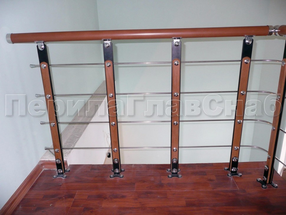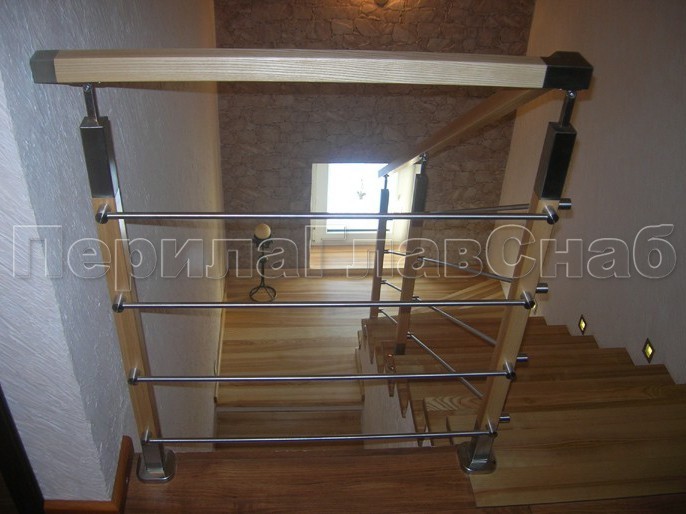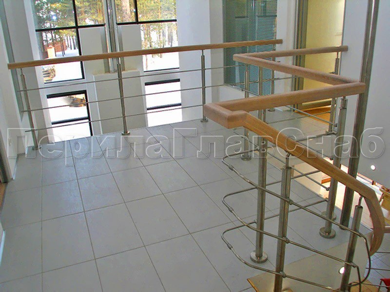 Четыре ригеля на держателях, квадратный деревянный поручень и квадратные стойки