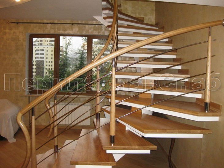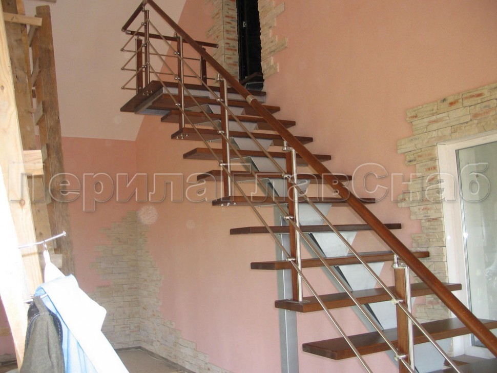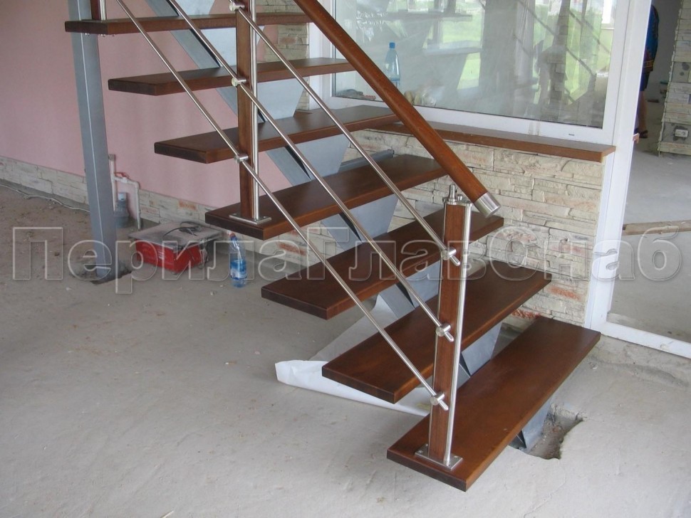 Ограждения с двумя стойками в каждую ступень с деревянным поручнем и без ригелей