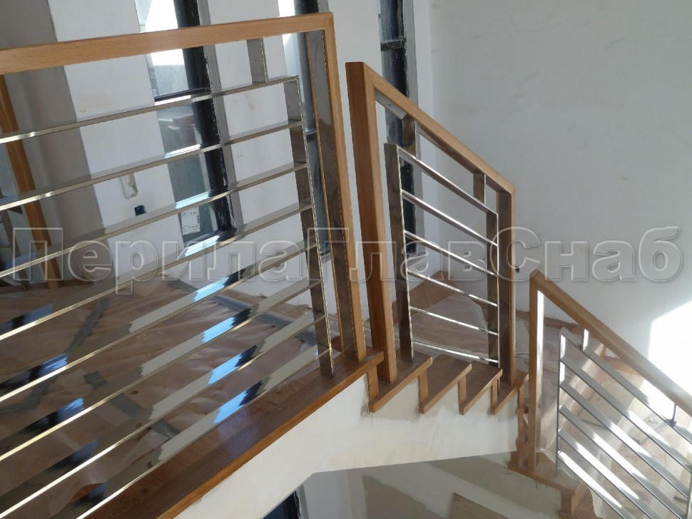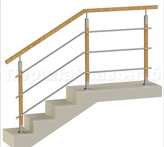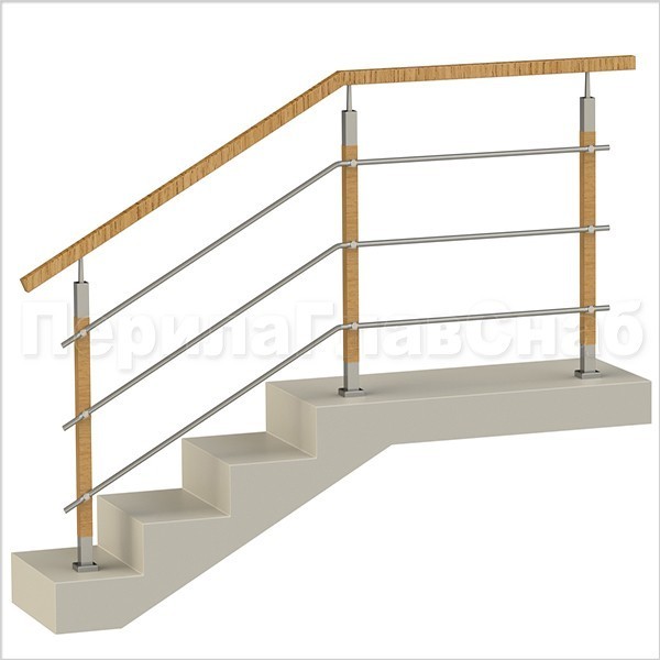 Три ригеля на сварке, квадратный деревянный поручень и круглые стойки