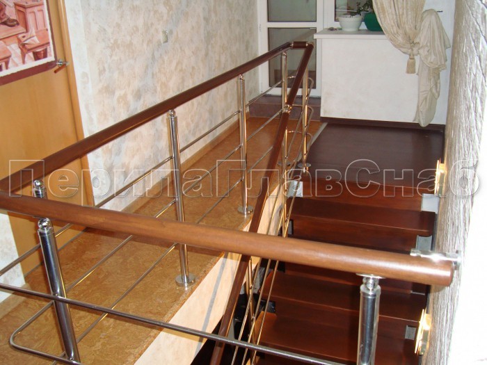 Нержавеющие ограждения без ригелей с круглым деревянным поручнем и стойками с деревянными вставками