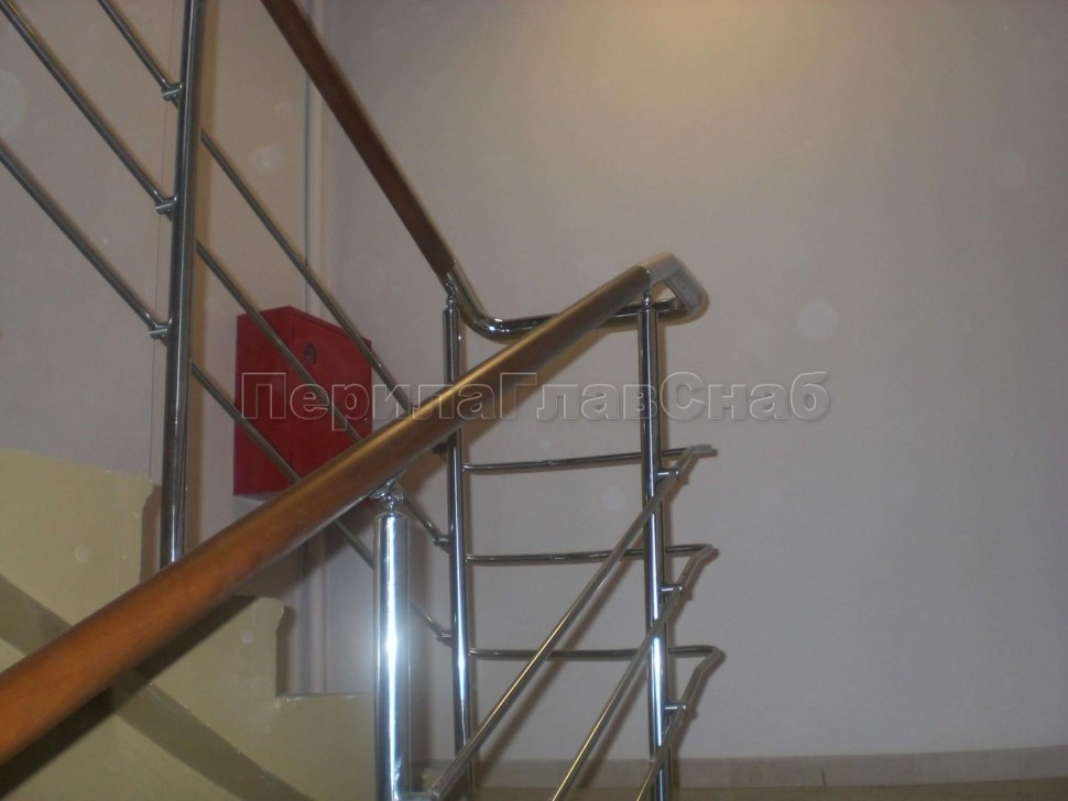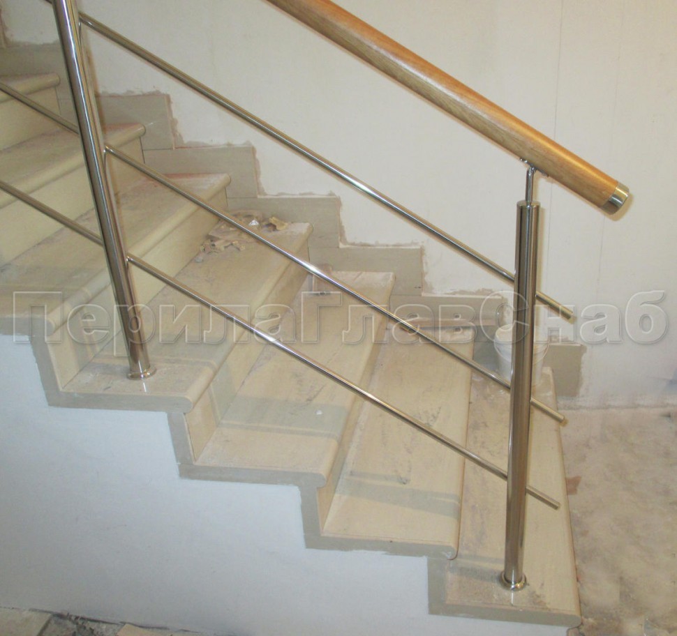 Три ригеля на сварке, квадратный деревянный поручень и круглые стойки