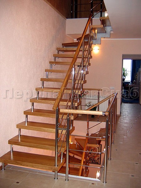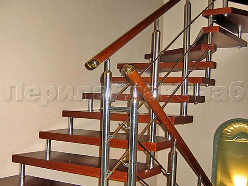 Ограждения с двумя стойками в каждую ступень с деревянным поручнем и без ригелей