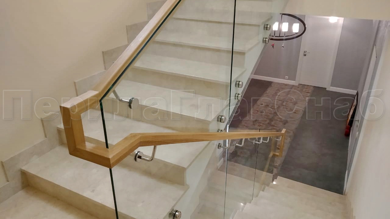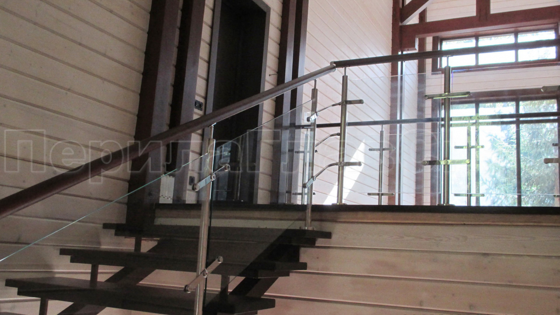 Четыре ригеля на держателях, квадратный деревянный поручень и стойки с деревянными вставками