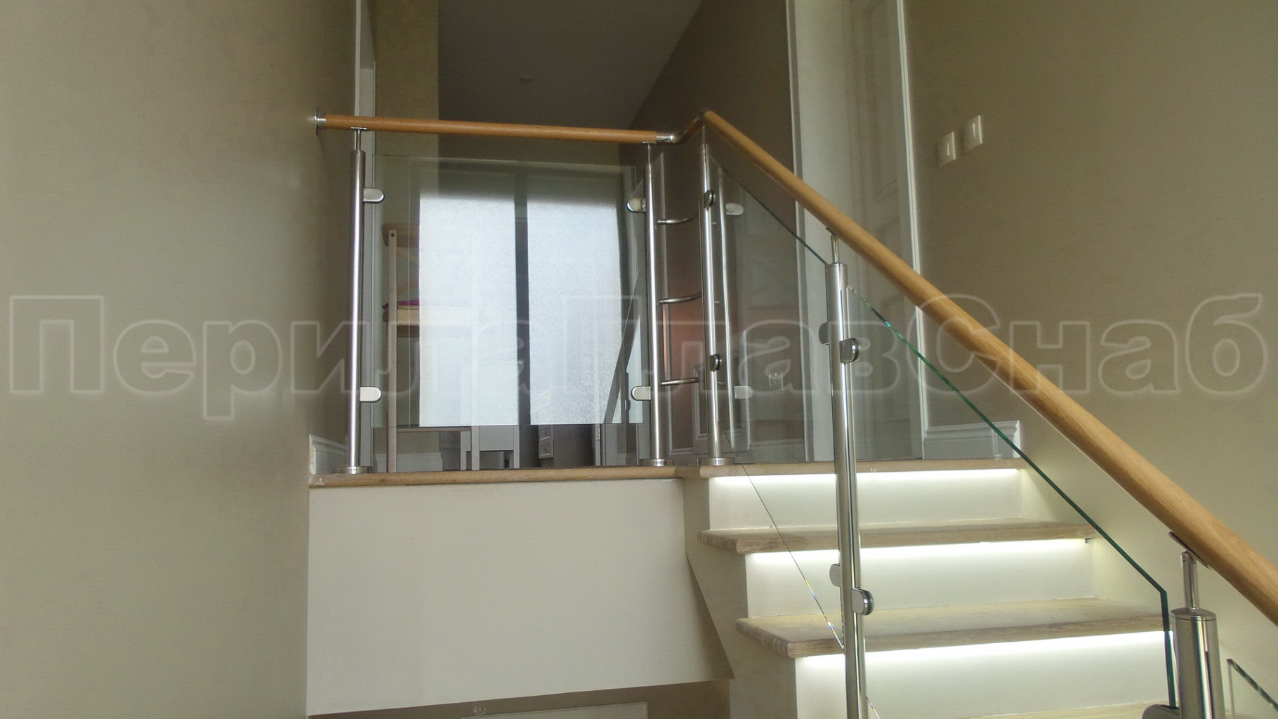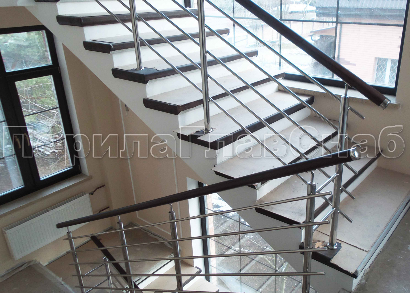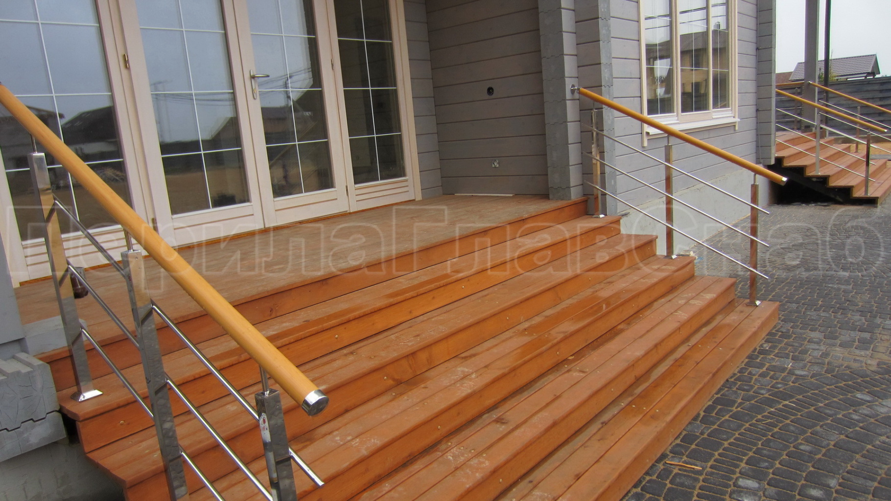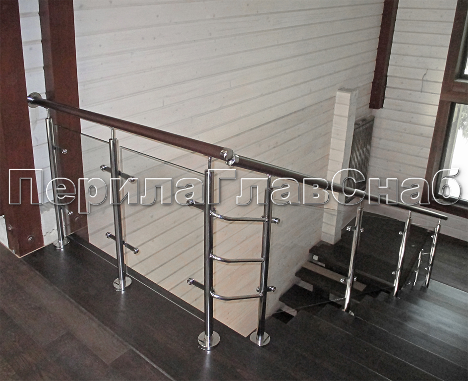 Нержавеющие ограждения без ригелей с квадратным деревянным поручнем в Волгограде. Готовые проекты ПерилаГлавСнаб