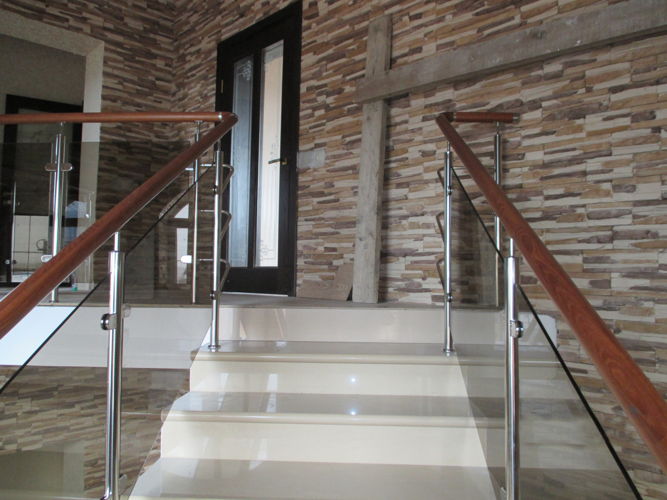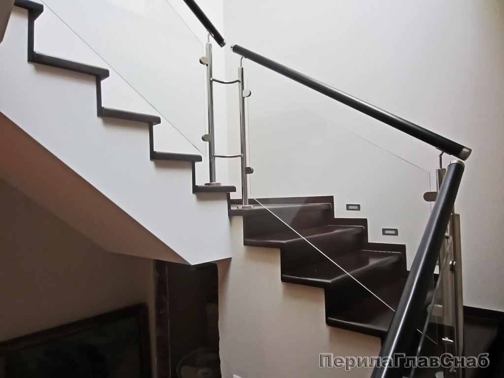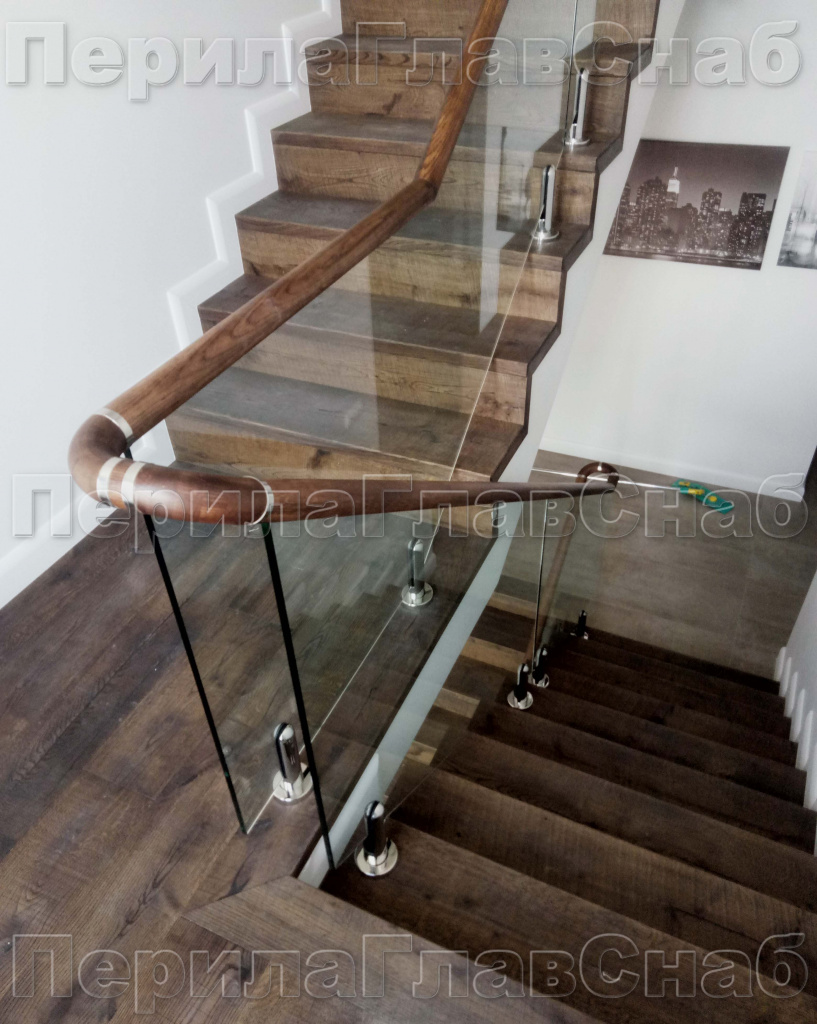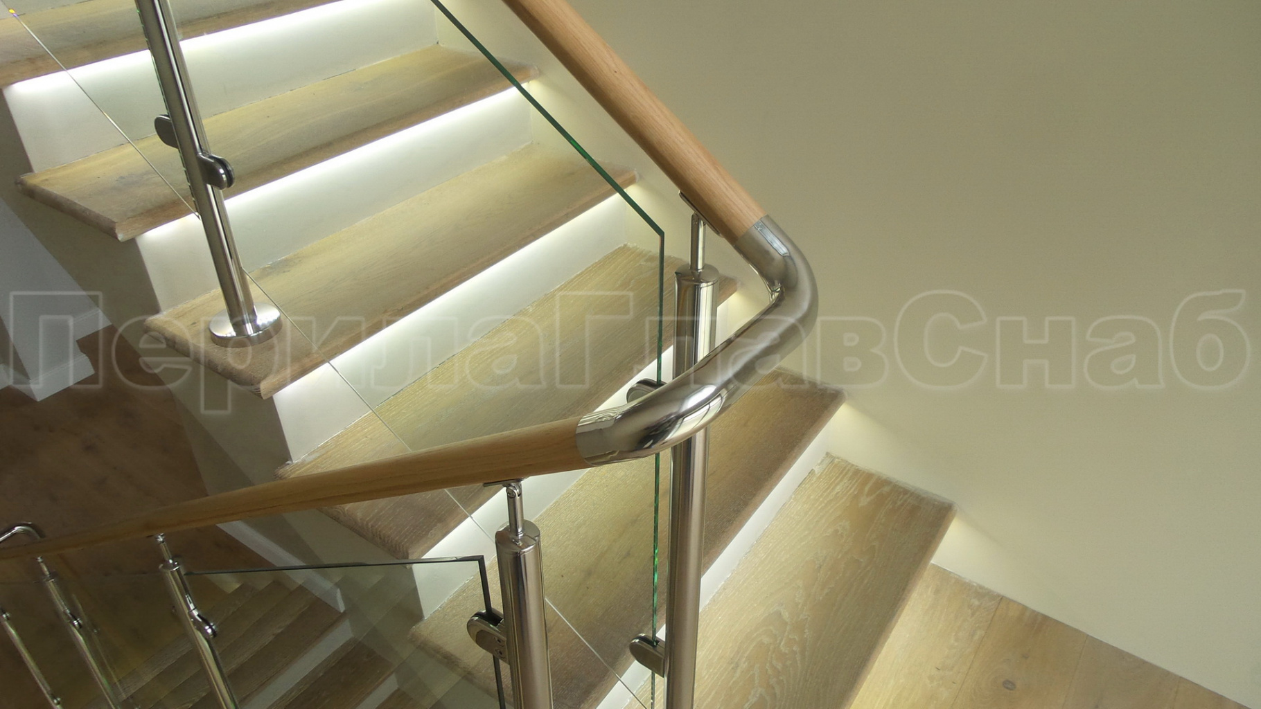 Нержавеющие ограждения без ригелей с квадратным деревянным поручнем в Волгограде. Готовые проекты ПерилаГлавСнаб