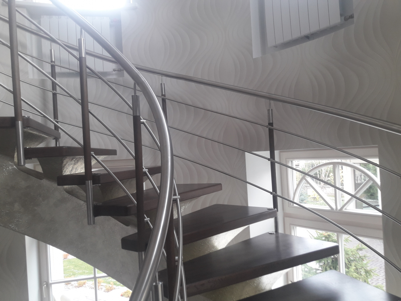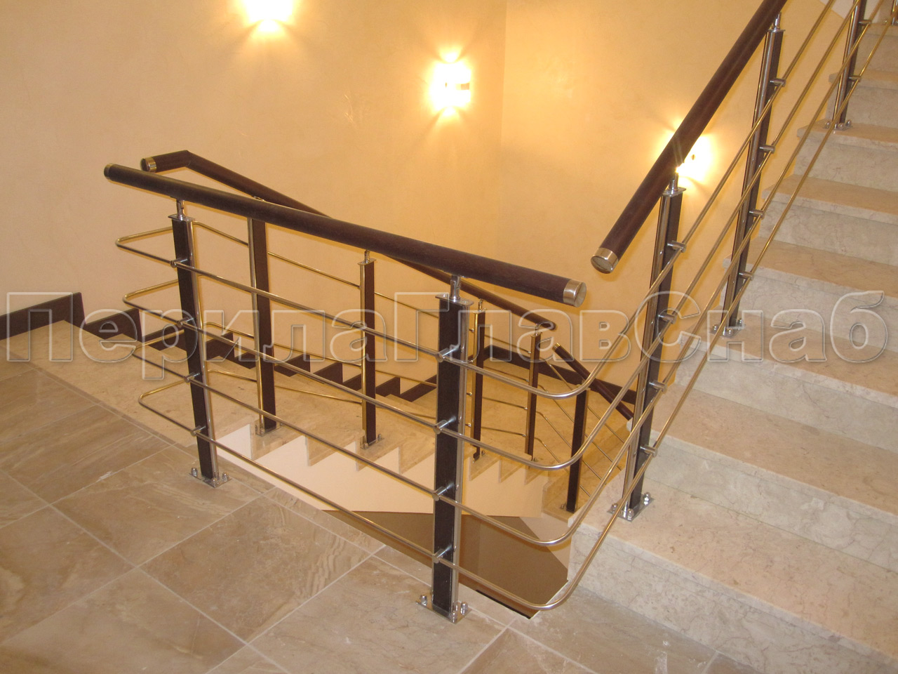Четыре ригеля на сварке, квадратный деревянный поручень и круглые стойки