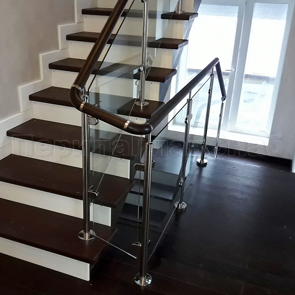 Нержавеющие ограждения без ригелей с квадратным деревянным поручнем и стойками с деревянными вставками в Волгограде. Готовые проекты ПерилаГлавСнаб - фото 1