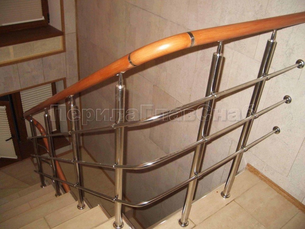 Нержавеющие ограждения без ригелей с круглым поручнем и стойками с деревянными вставками
