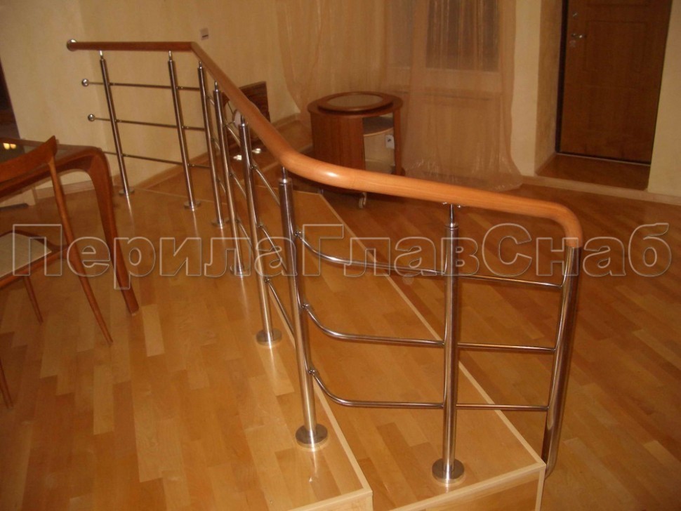 Три ригеля на сварке, квадратный деревянный поручень и круглые стойки