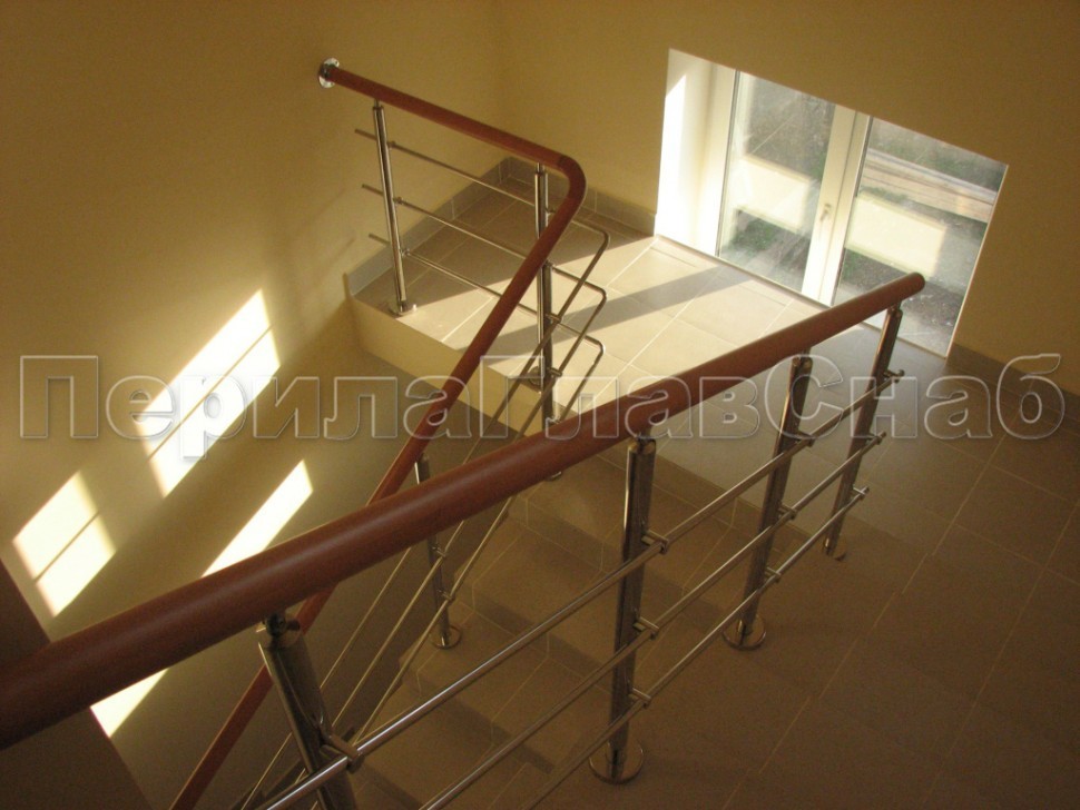 Нержавеющие ограждения без ригелей с круглым деревянным поручнем и стойками с деревянными вставками