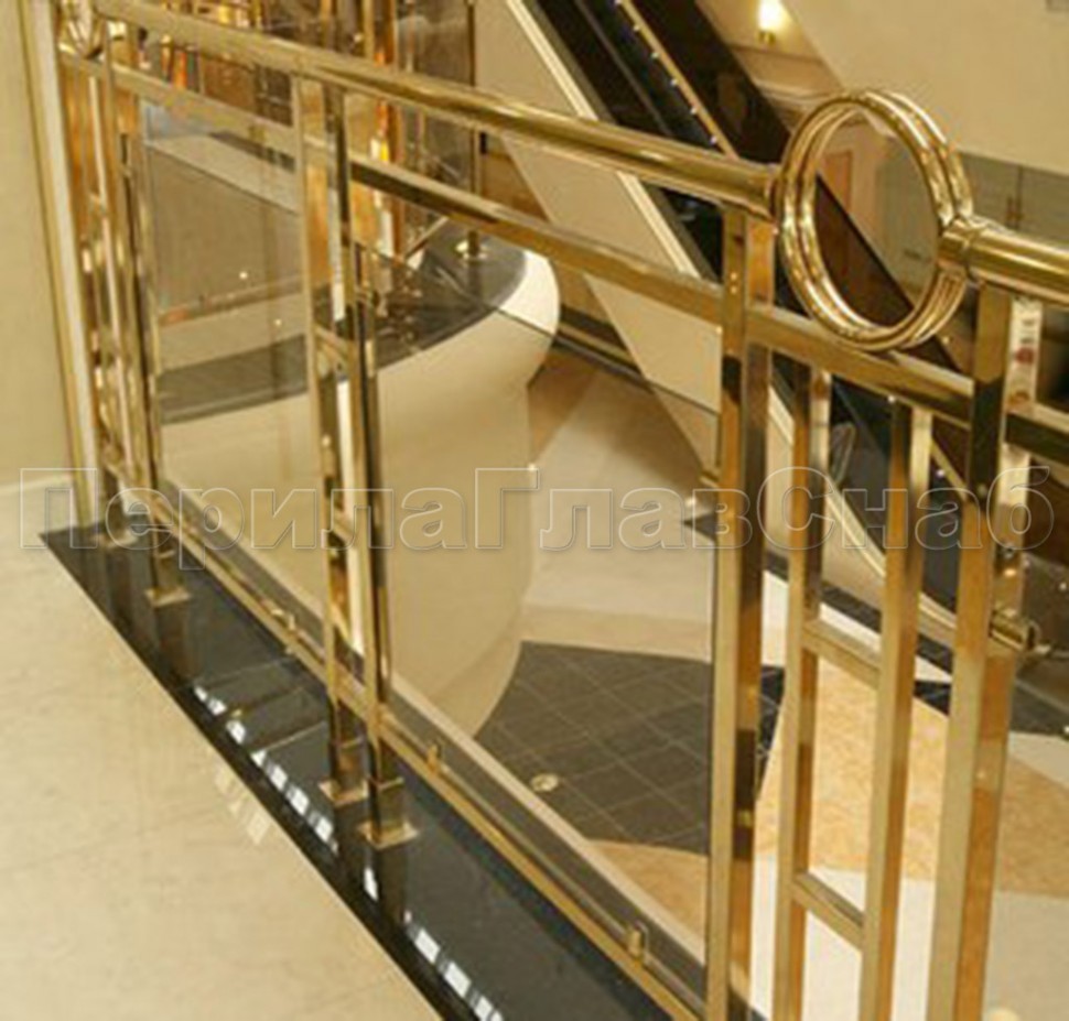 Ограждение лестницы с прозрачным стеклом, стойками и поручнем из латуни